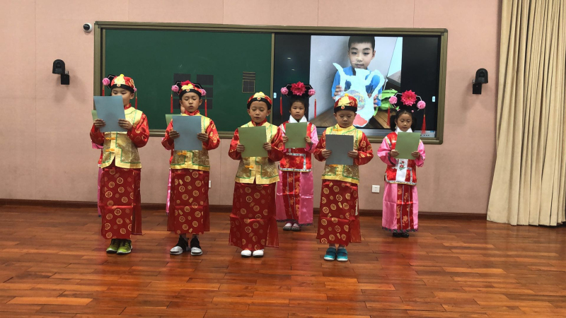 诗朗诵之后,学生们拿着自己在课堂上制作的作品,将自己的所学所得娓娓道来,张扬个性的同时更是进一步对所学传统文化知识的强化与共鸣。
