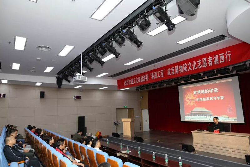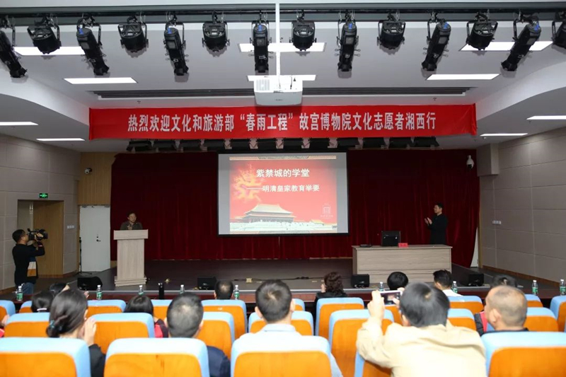 9月26日上午,“故宫教育活动湘西行”第一站来到位于吉首市的湘西州博物馆,举行活动启动仪式,并由故宫宣教部工作人员为100名湘西州文化、广电、新闻、出版系统的工作人员提供了专题讲座:《紫禁城的学堂——明清皇家教育举要》。讲座深入浅出、生动形象,以明清皇家教育制度、教育活动及故宫中相关古建、文物为线索,讲述明清皇帝、皇子的学习生涯。从古代皇家教育中发掘价值,引为当代文化、教育工作的借鉴。