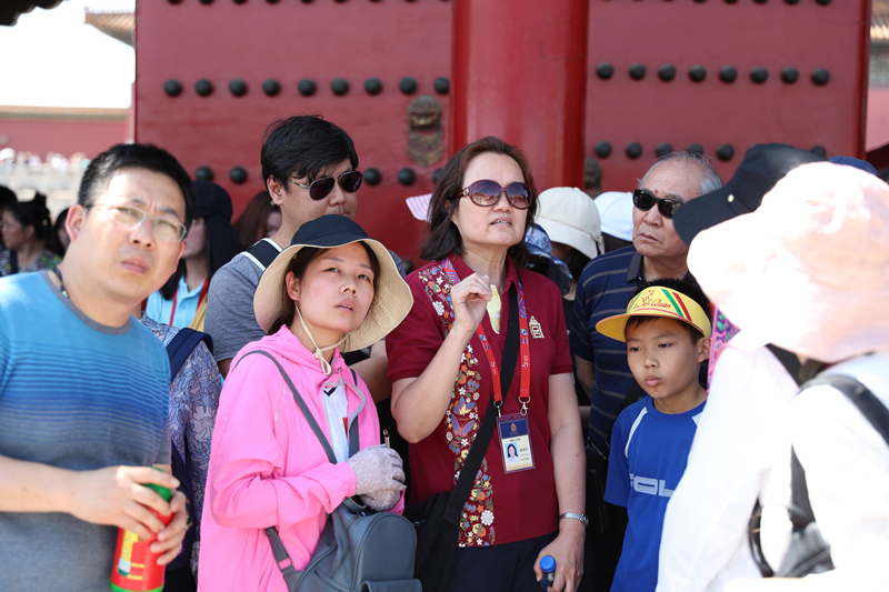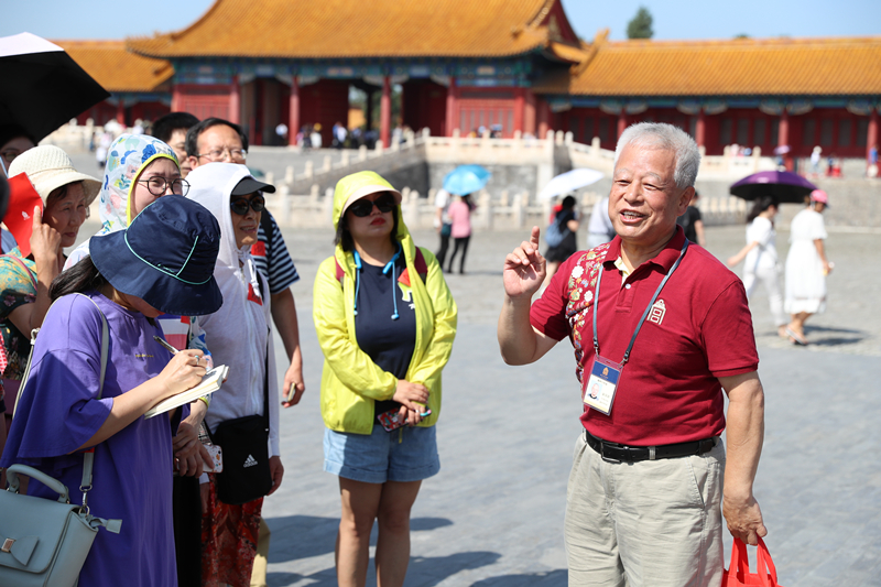 “讲故宫故事,展中华雄姿”主题导览活动中,3名资深故宫志愿者为预约观众介绍故宫博物院发展历史和古建筑的历史沿革,同时穿插故宫历史人物事迹,以生动的言语向公众分享这座特殊博物馆背后的故事。活动当天虽然艳阳高照,但志愿者老师却毫不懈怠,用激情的讲解感染每一位观众。大家行走在古建筑之间,体会中华民族文化的传承与复兴。