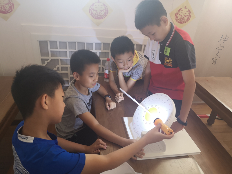 “寻日影踪迹,探计时奥秘”为第三项主题课程。比如太和殿前的石座上,就矗立着一座汉白玉日晷。随着一天中太阳位置的变化,晷针的影子也随之行走在石盘的刻度上,日复一日地记录着历史。活动中,同学们在老师的带领下认识日晷的由来、构造及分类,并学习如何通过日晷判断时间。利用日晷教具,同学们用手电筒模拟太阳照射,感受日晷的计时状态及原理。最后,大家还亲自制作了小型日晷模型,进一步巩固相关知识,并带着亲手制作的模型在室外进行实地观察。