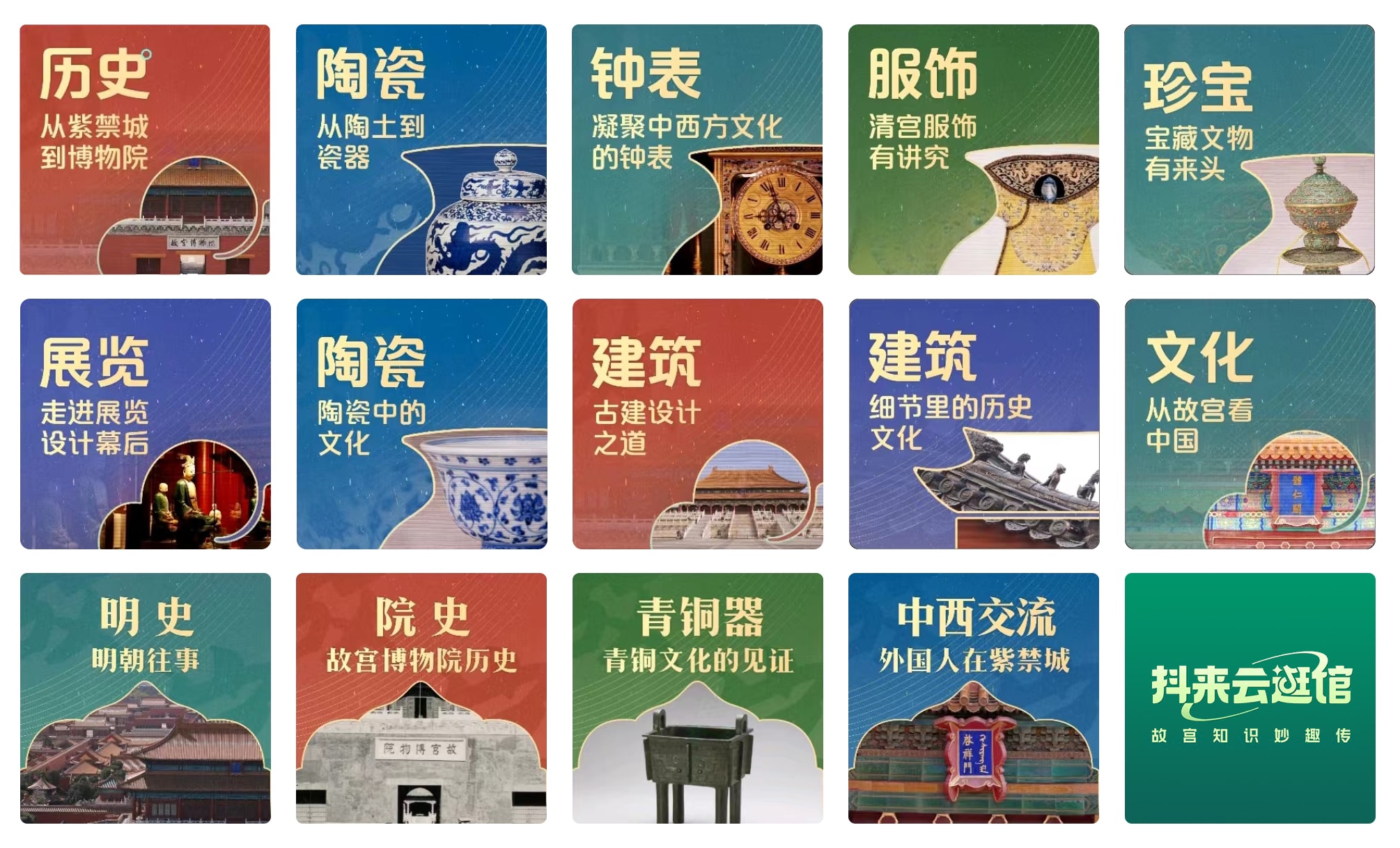 上半年,故宫博物院与抖音共同推出“抖来云逛馆”计划,助力故宫的藏品文物视频化,打造视频版百科全书。 “故宫博物院”抖音账号现已上线历史篇、陶瓷篇、钟表篇、服饰篇、珍宝篇、青铜器篇、建筑篇、中西交流篇等十四个合集。