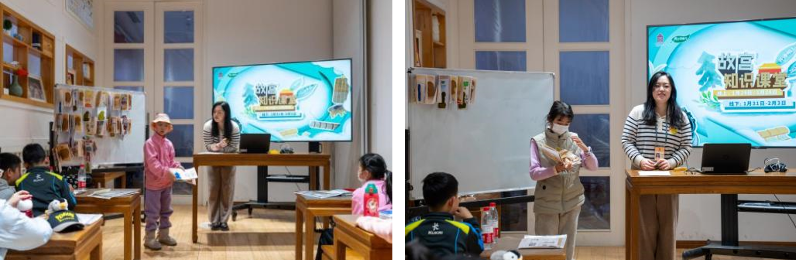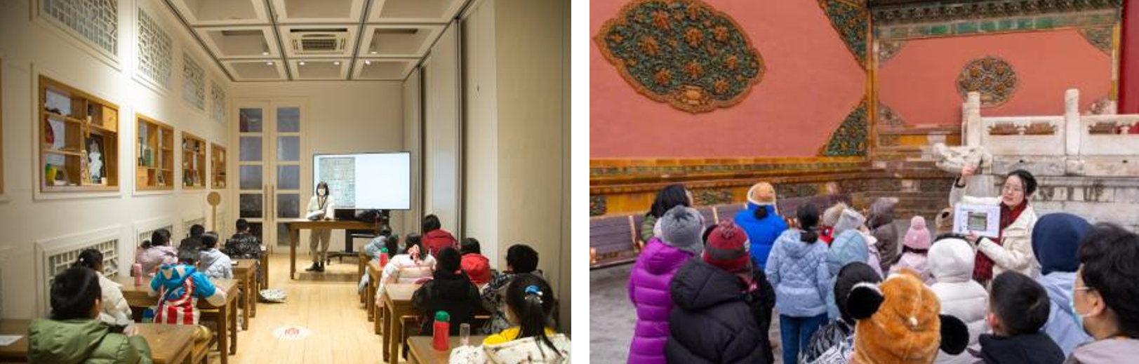 “紫禁城中的天然材料”课程,通过趣味科普讲座,带领孩子和家长一起梳理了紫禁城里不同类型的建筑材料,大家惊叹于工匠们因地制宜的设计的同时,也了解了工匠对不同材料的加工、装饰手段。“紫禁城内的人工材料”课程中,大家则跟随授课老师走出教室,来到乾清门前,实地观察和探索影壁与脊兽,充分调动学生们的积极性,让课堂“活”起来。