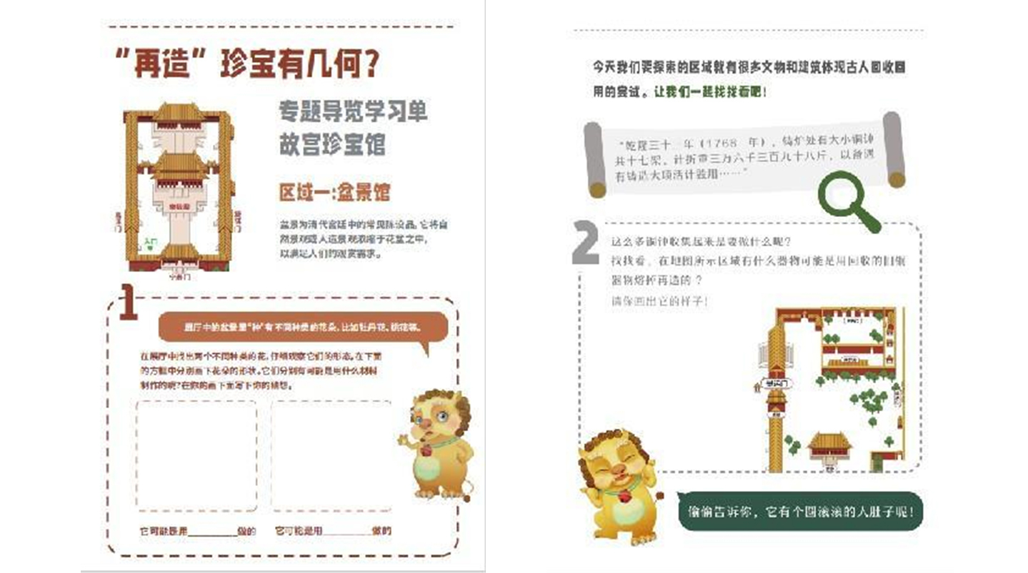 “钟表零件还回收?”“‘再造’珍宝有几何?”“故宫里的零废弃”“夏日花信 绿色故宫”,几个主题导览配合设计的学习单,既带领观众了解了某一展馆或建筑区域的文物、建筑、自然环境等基础知识,更在该基础上引导观众关注、思考日常不易发现的细节,在细节中感悟古人的“零废弃”智慧,感受现代故宫的“零废弃”实践努力。