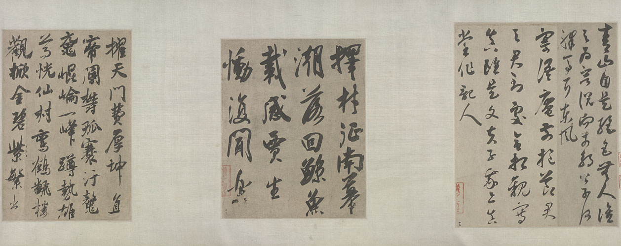 此卷以行、草书杂录前人诗句共十则,书于十纸之上,裱为六段,其中数则有缺佚字句。十则释文: