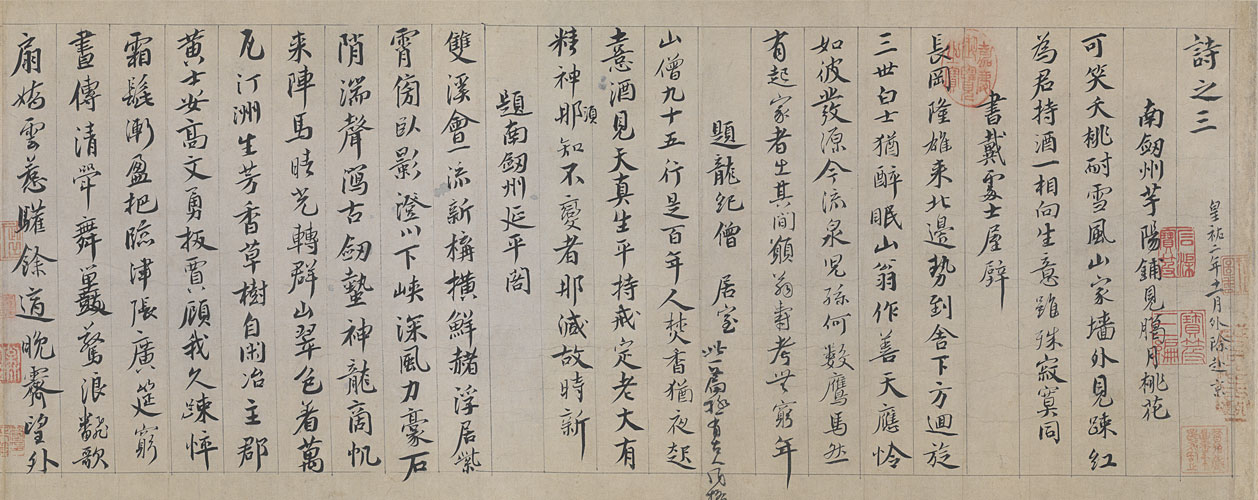 卷尾有宋代蔡伸、杨时、张正民、蒋璨、无名氏、向水,元代张雨、张枢,明代陈朴、匡山凷翁、胡粹中、清代王文治及近代朱文钧等十三家题跋。本幅第三首诗题下有小字批语“此一篇极有古人风格”,据杨时题跋称,乃欧阳修所书。鉴藏印记:“贾似道印”、“悅生”、“贾似道图书子子孙孙永保之”、“武岳王图书”、“管延枝印”以及梁清标、清嘉庆内府诸印。