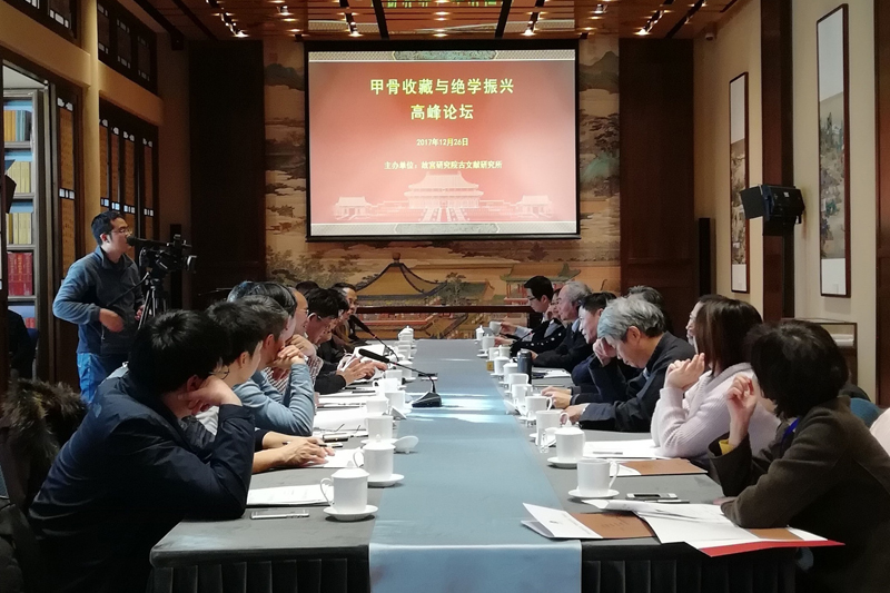 此次高峰论坛的召开,正值中国最古老成熟文字荣获与世界其他文献遗产同等国际地位之际,如何抓住这一有利时机,加强甲骨保护和振兴甲骨文绝学,成为文博单位、大专院校、社会科学院专家学者都需要面对的重要课题。为此,本高峰论坛诚邀中国国家图书馆、北京故宫博物院、中国社会科学院考古研究所、中国社会科学院历史研究所、北京大学、清华大学、上海博物馆、南京博物院、山东博物馆、旅顺博物馆、天津博物馆等11家作为主体申报“世界记忆名录”的甲骨收藏单位的领导和学术代表,以及来自重庆中国三峡博物馆、中国文字博物馆等文博单位的代表和吉林大学、安徽大学、复旦大学、浙江大学、中山大学、河南大学、首都师范大学、安阳师范学院等大专院校的领导和专家学者近50人与会,共襄盛业。此次高峰论坛的主办和召开,得到教育部、国家语委、故宫博物院、故宫研究院的大力支持。