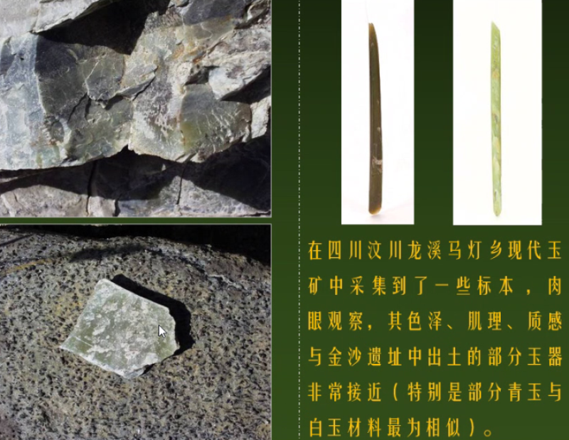 明晰古蜀玉料成分后,主讲人随后讲述了古蜀玉料产地来源调查的过程和结论。主讲人先后到新疆、四川、辽宁、甘肃、陕西等地的玉石矿区进行调查比对,初步得出金沙遗址部分玉料可能出自四川汶川龙溪乡、彭州一带玉矿的结论,引发了讨论。