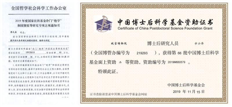 博士后在申报各类基金方面取得了一定的成果和突破,其中李文益申报的《康熙朝内务府满文档案的整理、翻译与研究》获得2019年度国家社科基金冷门“绝学”和国别史等研究专项,这是我院博士后首次获得该类基金资助;方小济申报的《故宫养心殿西暖阁唐卡装衬织物保护修复方法研究》获得第66批博士后科学基金面上二等资助。