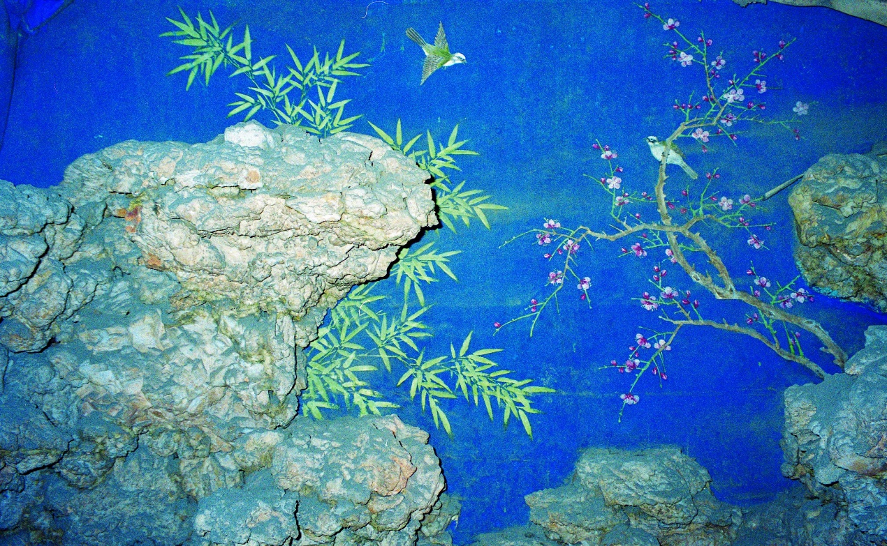 许彤介绍完了香雪的结构和装修后,对西、北、东三面墙上的贴落的绘制者进行了考证。贴落背景青蓝色,如冬季寒冷天气下的晴朗天空,上绘松竹梅与雀鸟形象,造型生动。结合活计档等资料,乾隆四十年前后,杨大章曾大量参与太上皇宫内的贴落绘制工作,其中乾隆四十一年十一月有一条重要记载:“二十一日接得郎中图明阿押帖内开:初十日首领董五经传旨:宁寿宫养心殿香云殿内三面青地墻着杨大章画松竹梅。”在众多宫廷画家中,杨大章尤擅花鸟,他绘制的松竹梅贴落通过和宣石假山的组合,以及与室外园林中真实的天空、假山、植被相呼应,制造出有趣的视错觉空间。