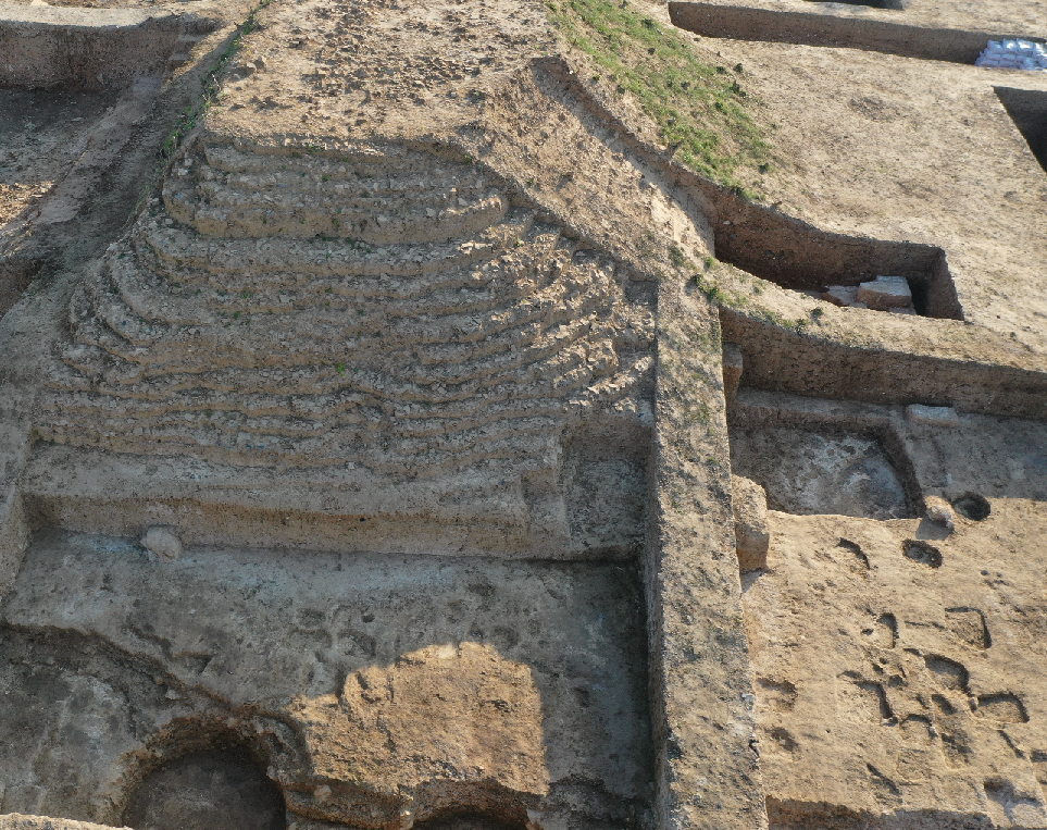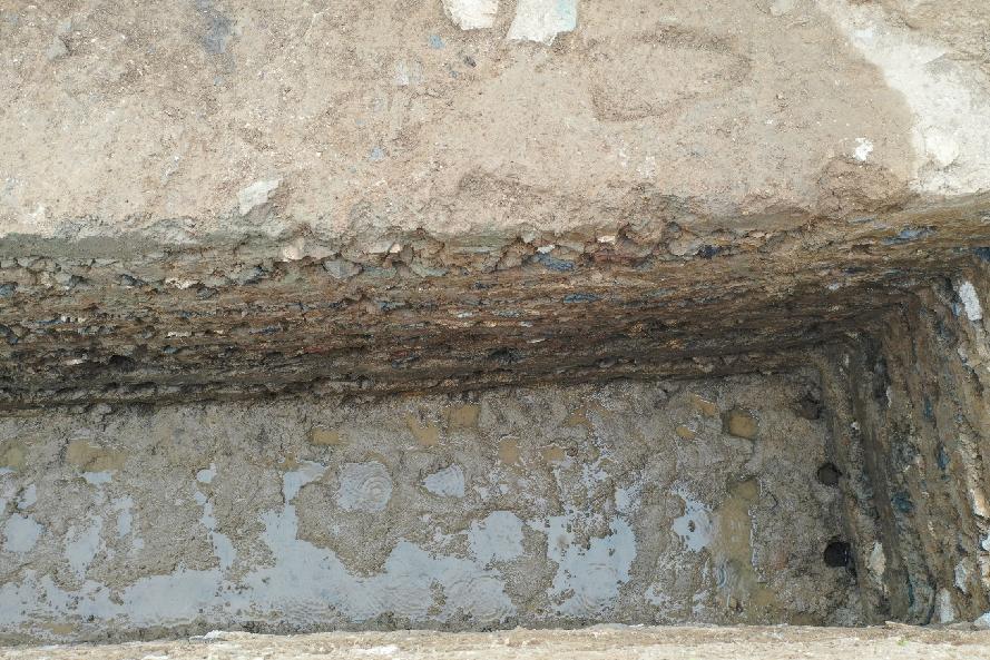 一、揭示出涂山门为单门道券洞式城门,城台底部南北宽约39.5米,东西进深约23米,为内夯土外包砖结构,夯土芯采用一层砖瓦一层土的“夹瓦扎“夯法。城台北侧贴着城台北壁设置东西向马道,也是内填夯土、 外甃砖石的结构。城台南侧与外郭城土城墙之间以砖墙连接。城台、马道及砖城墙均坐落在地下挖有基槽的夯土平台之上,并存在明确的先后营建次序。基槽及平台夯土也采用一层砖瓦一层土的夯法,城台部分的基槽底部还见有地钉。