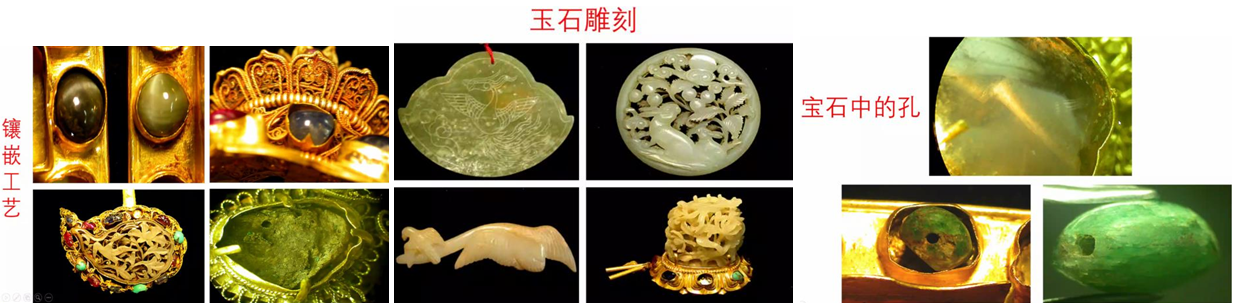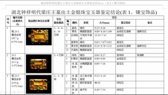 随后,主讲人讲述了梁庄王墓出土金银珠宝玉器的检测过程、方法和分析结果。中国地质大学(武汉)珠宝检测中心与湖北省文物考古研究所一起对主要器物进行了检验,运用宝石显微镜、傅里叶红外光谱仪、紫外-可见分光光度计、x荧光光谱仪、电子探针、测金仪等检测设备对代表性样品进行成分和谱学分析,完成了一本详尽的检测报告。