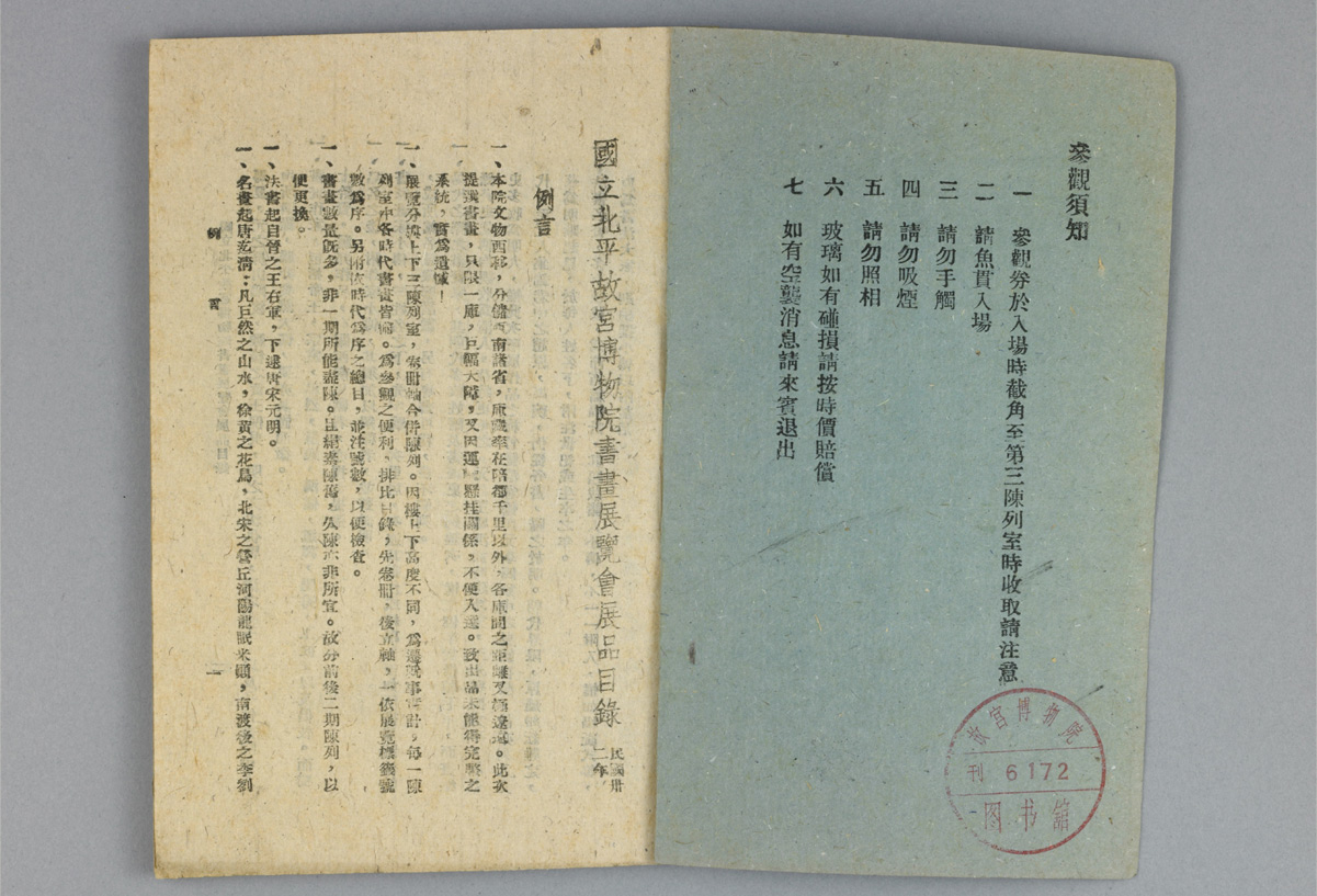 1943年冬季,陪都重庆多雾,日军很少来轰炸,环境相对安全,故宫博物院从存储安顺华严洞的院字号箱件中选题书画142件,由庄尚严等人将参展文物押运至重庆中央图书馆展览,展览名称为“国立故宫博物院书画展览会”。分两期举行,首期展览时间为1943年12月25日至1944年1月4日,第二期展览时间1944年1月5日至16日。为了方便参观,展品目录编排顺序以展览标签号码为序,先卷、册,后立轴,依次排列。虽处战争时期,但此次故宫书画展览会可谓轰动一时,各界名流及众多艺术家前去参观品评,至今保留下多篇评论。主讲人认为重庆书画展象征着中华民族不屈不挠的精神。