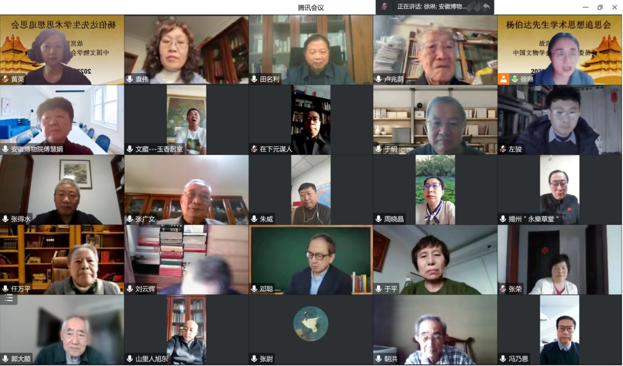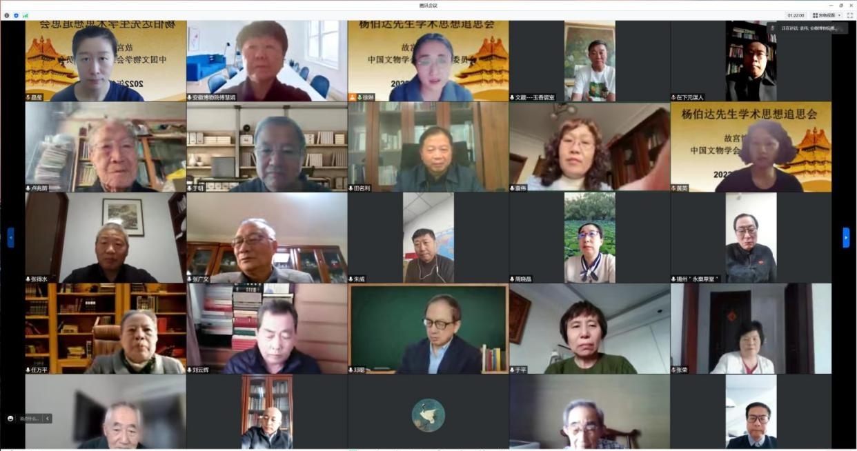2022年12月20日为杨伯达先生诞辰95周年纪念日,为深刻缅怀先生,故宫研究院玉文化研究所和中国文物学会玉器专业委员会于12月20日联合举办“杨伯达先生学术思想追思会”。受疫情影响,本次追思会采取线上会议的方式。故宫博物院院长王旭东、副院长任万平、研究馆员张广文、张荣、中国社会科学院考古研究所研究员卢兆荫、辽宁省文化厅原副厅长郭大顺、北京大学考古文博学院原党委书记赵朝洪、恭王府博物馆馆长冯乃恩、陕西省文物局原副局长刘云辉、北京市文物局原副局长于平等30余名领导、专家和学者出席了会议。玉文化研究所所长、玉器专业委员会主任委员徐琳主持会议。
