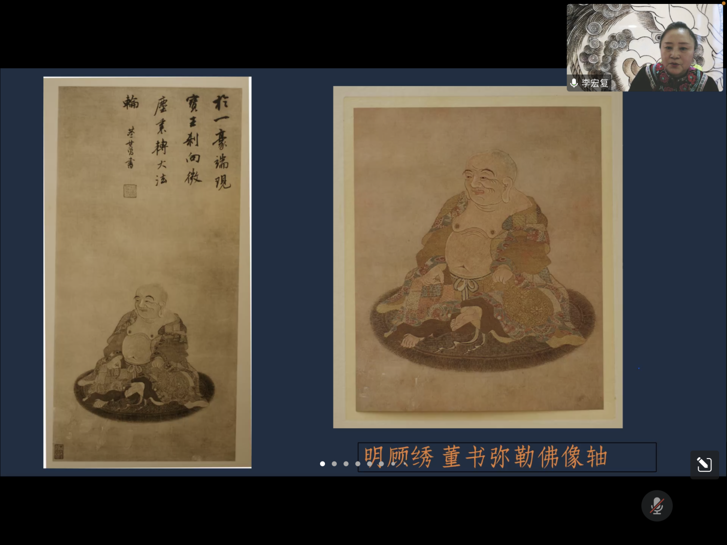 李宏复老师也有在吉林市博物馆的工作经历,十多年致力于中国刺绣文化的研究和非遗传承的研培工作,她首先从2006年在潮州调研看到的当地以顾绣为招牌的厂店说起,而后对宋元以来中国的刺绣历史进行概要性的梳理,揭示出顾绣的历史渊源及其长久而广泛的历史影响。李老师认为露香园顾绣继承了宋元以降的针法,其成功成名除了其做为闺阁绣、画绣的高品质外,很重要的一点是作品有了大家推重,松江华亭地方的陈继儒、董其昌等人是顾绣不可忽视的推手。书画宗师对顾绣的赞赏在故宫藏《韩希孟绣宋元名迹册》中可谓不吝溢美:“璀璨五丝,照耀千古”、“针丝生澜”、“夜来神针”、“玄功莫状”、“影落生绡,驻以仙组”等等,正是露香园闺阁以针丝对文人书画美学的精彩演绎,在宗师级大家的赞美和推誉中,“顾绣”这一名牌响彻南北,成为高品质、高艺术品位刺绣的代名词。