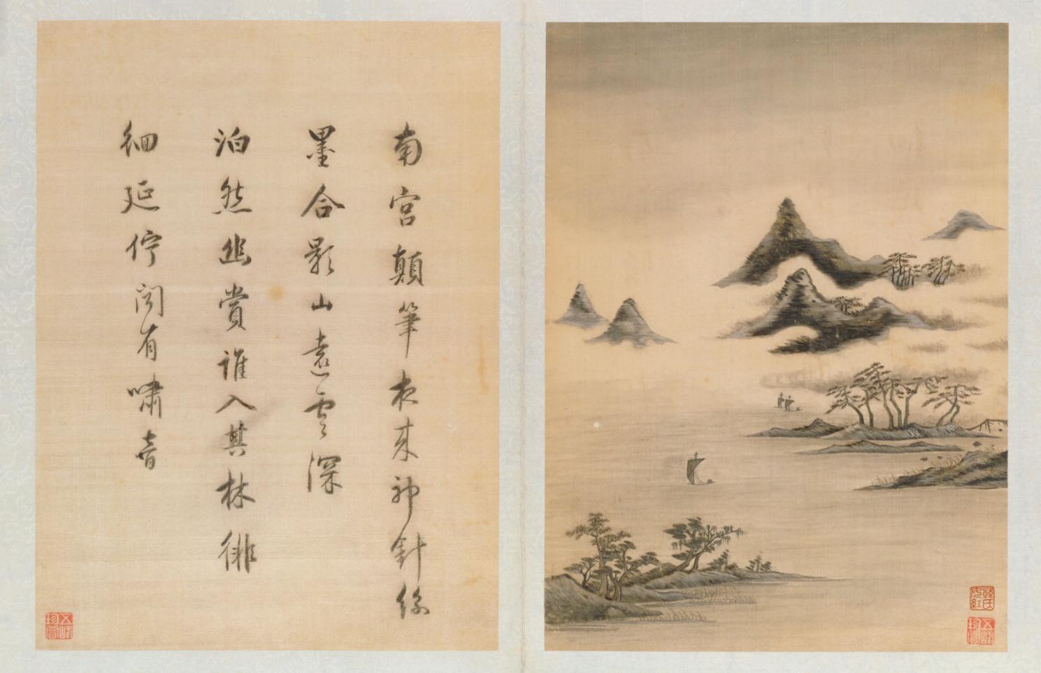 韩希孟绣宋元名迹册“米画山水”页,董其昌将米芾之笔与韩氏之针并誉——“南宫颠笔,夜来神针。”