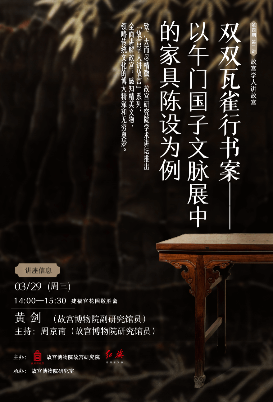 2023年3月29日下午,故宫博物院宫廷历史部黄剑老师作题为“双双瓦雀行书案——以午门国子文脉展中的家具陈设为例”专题讲座。这是“故宫学人讲故宫”系列讲座第四期第二讲。黄剑老师,1979年生,毕业于中国艺术研究院,艺术学硕士。2002年进入故宫博物院宫廷部工作,一直从事院藏古代家具文物的保管、鉴定和研究。代表性论文有《清代宫廷屏风概述》、《清宫杂项买办库票中所载洋漆家具用料解析》、《乾隆朝造办处随围档案解析》、《乾隆朝宫廷花梨木用量研究》等。