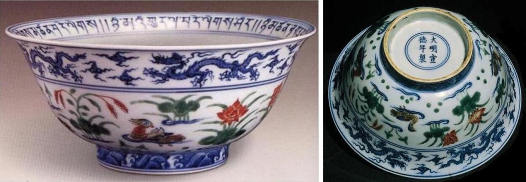 其中,萨迦寺是西藏萨迦教派的主要寺院。萨迦教派在元代时,由于得到元朝政府的支持,曾盛极一时。明代的萨迦派仍不失为西藏的一大教派,明朝曾封萨迦派的首领为大乘法王、赞善王等。萨迦寺所藏明代瓷器,多为官窑精品,很可能是明朝廷的赏赐或馈赠。萨迦寺仅官窑瓷数量就达近2000件,其中,宣德青花五彩莲池鸳鸯纹碗和宣德青花五彩莲池鸳鸯纹高足碗是迄今所发现烧造年代最早保存最完好的宣德青花五彩器,书有藏文的宣德青花五彩碗显然是明廷专为赠送西藏而烧制的,印证了文献记载,也是明代中央政府向萨迦寺赐送的实物见证。
