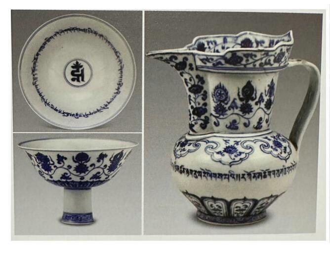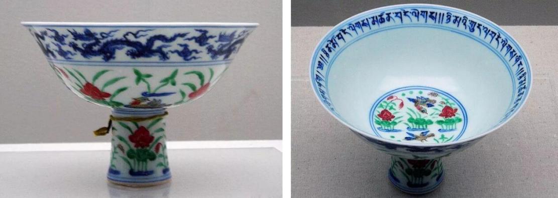 第三,所收藏的高足杯(碗)数量多、质量高、品种丰富。高足碗不仅在西藏博物馆有收藏,布达拉宫、罗布林卡及萨迦寺等处也有发现,均为“靶茶锺”一类。其收藏年代跨度大,从元至清乾隆,跨越元明清三朝数百年之久。品类丰富,涵盖陶瓷、玉器、雕漆等多种工艺。另未发表的高足碗资料,也数量较多。这些高足碗中,虽偶有元代制品,但最早的一批主要为永乐、宣德官窑产品。这批永宣时期的高足碗及配套的执壶、僧帽壶等,无论是甜白、宝石红、翠青,还是青花、五彩等,工艺美轮美奂,质量之高,堪称空前绝后,从此开启了此后数百年高足碗在藏地寺院的流行风潮。