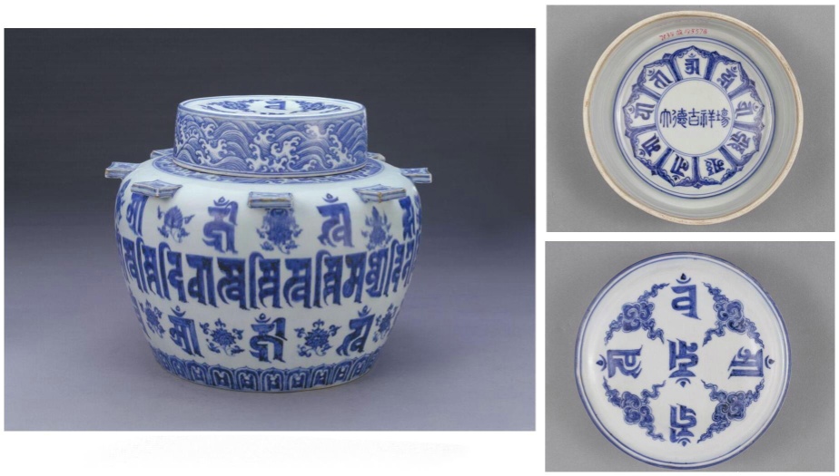 明清御窑厂受命生产藏文化特色的瓷器的主要是供皇家使用或朝廷赏赐西藏上层人士。这些瓷器在造型和纹饰方面有浓郁的藏文化艺术风格。首先,在造型上,仿制藏文化传统器物造型,烧制藏传佛教用器及藏族日常生活用具等。如故宫博物院藏有明宣德青花梵文出戟盖罐,为宣德五年(公元1430年)为来京的西藏大宝法王乌斯尚师哈里麻举行法会而烧制的。造型与西藏称为“曼陀罗”的供器相似。通体书梵文、八宝、莲瓣纹,器书有“大德吉祥场”。造型、纹饰具有鲜明的藏传佛教艺术特点。此形制器物传世2件,另景德镇御窑厂遗址也有出土。