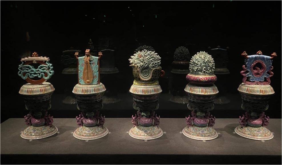 清王朝作为由少数民族入主中原而建立的封建政权,利用宗教文化为政治服务是其巩固政权的基本措施之一。紫禁城里与宗教相关的神殿佛堂,不仅数量多,而且“儒、释、道”三教并存,圣人、佛相、天尊同在。此外,一些民间俗神和清代满族人所崇信的萨满教祭祀,也各占一席之地。清代紫禁城内最重要的宗教是藏传佛教。故宫博物院收藏瓷器中有不少清代宫廷遗留的藏传佛教用器,其中以乾隆朝景德镇御窑厂产品最为多见,如五供、佛塔、七珍、八宝、观音像、无量寿佛像、释迦牟尼佛像等。