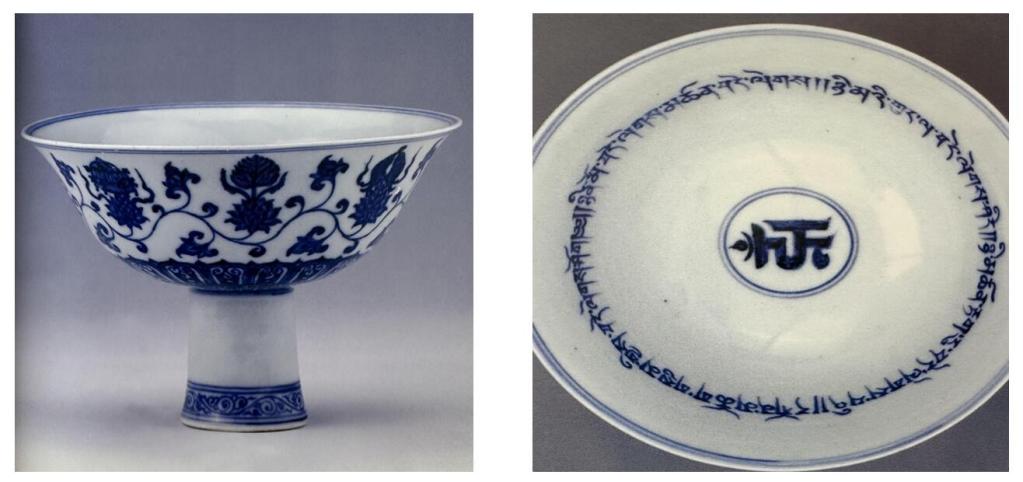 其次,在纹饰上,采用藏文化传统图案装饰瓷器。明清时期,瓷器纹饰中采用藏传佛教图案和西藏流行的吉祥图案作装饰的有八吉祥、缠枝莲、缨络、宝杵、梵文、藏文、佛家吉语纹等。宣德青花缠枝莲托八宝纹高足腕,外壁绘缠枝莲托八宝纹,内壁书藏文,译为“白日平安,夜晚平安,中日平安,日夜平安”。