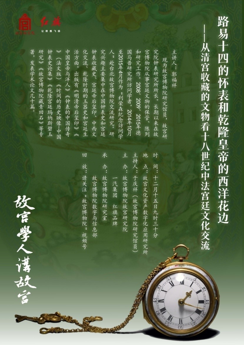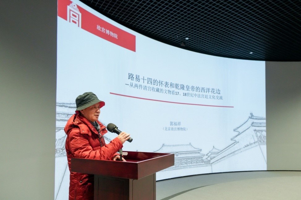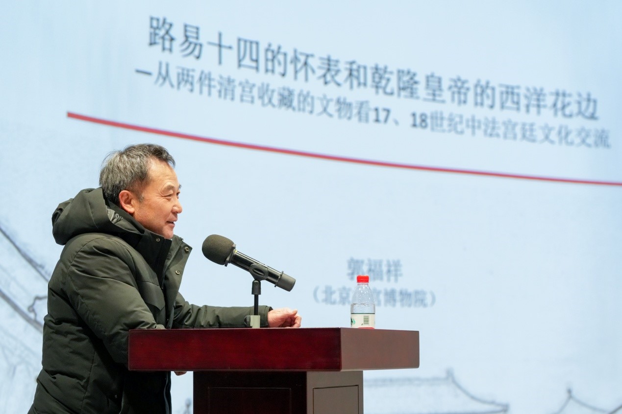 2023年12月15日上午,故宫博物院宫廷历史部副主任、研究馆员郭福祥老师作题为“路易十四的怀表和乾隆皇帝的西洋花边:从清宫收藏的文物看十八世纪中法宫廷文化交流”的专题讲座。郭福祥,现为故宫博物院研究馆员,故宫研究院钟表研究所所长。长期以来在故宫博物院从事宫廷文物的保管、陈列和研究工作。2008、2009、2015年德国马普研究所访问学者,2014年10月至2015年4月作为“利荣森纪念访问学人”赴台北故宫博物院交流研究。研究兴趣主要集中在中国钟表史和宫廷钟表收藏史、宫廷帝后玺印、中西文化交流、乾隆时期的玉器史和宫廷生活方面。出版有《明清帝后玺印》《中国皇帝与洋人》《钟表的中国传奇》(法文版)《时间的历史映像-中国钟表史论集》《乾隆宫廷玛纳斯碧玉研究》《故宫博物院藏青田石》等专著,发表学术论文数十篇。
