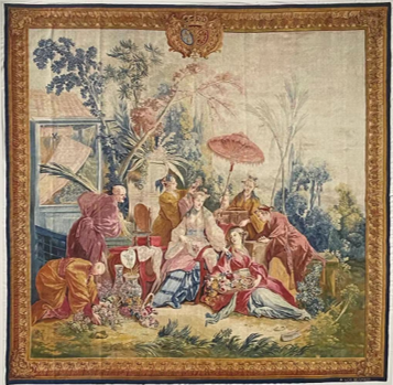 在第三部分,郭福祥老师介绍了三件挂毯,第一件是故宫博物院藏人物缂丝挂毯,该挂毯是清中期制作而成,毯边饰为欧洲一时流行的相框式构图,为壁毯增加了艺术美感,可谓为中西合璧的织物。第二件是美国克利夫兰艺术博物馆收藏的中国缂丝挂毯,此件挂毯1914年从中国流入英国伦敦,1942年入藏克利夫兰艺术博物馆。他提到故宫博物院万秀锋研究馆员揭示了这件挂毯的制作经过,根据万秀峰的研究结果,这件缂丝挂毯只是乾隆皇帝一系列挂毯制作工程的一部分,从乾隆三十四年(1769)至四十年(1775年)制作完成,共制作了三件。郭老师考证了第一件挂毯可能为乐寿堂东暖阁北窗户悬挂,第二件挂毯可能为养心殿后殿明间北窗户悬挂,并指出确定这两件挂毯与档案和悬挂地点的对应关系,对重新认识两件挂毯的文化价值非常重要。透过其制作档案,可以明确乾隆皇帝对挂毯提出了非常具体的要求,“周围寸边,随本身素地,不要花纹。大边织做西洋式花边。中间人物不要像先织做过西洋有影子线法毯子样式,俱照画样织做,不要西洋气。”对于挂毯主体的中间人物,他不但要求摒弃西洋“有影子”和“线法”的技法,而且在人物塑造上也不能带有西洋气息。而与主体人物的要求形成鲜明对照的是,对挂毯边饰却“织做西洋式花边”。循此可以得知,两件缂丝挂毯这种中式主题、西洋花边的创意正是来自于乾隆皇帝本人。这里“有影子”和“线法”都是典型的西洋绘画技法。“有影子”应该是乾隆对西方绘画中光影效果的通俗说法。“线法”则是利用透视画法使作品具有很强立体感的绘画方法。在清代宫廷绘画实践中,尤其是在清宫服务的西方传教士画师及受其影响的中国画师中都有运用,并作了适当改造以适应中国之传统。第三件是法国制作的全套“中国题材挂毯”(六件),该套挂毯是两个在法国学习和生活长达十几年的中国人带给中国官方的礼物之一,这组中国题材挂毯是根据法国中国风艺术设计大师佛朗索瓦·布歇创作的中国风情风俗画,由博韦工坊在1758 年至1760 年间编织。挂毯上的法国洛可可风格的风俗景观描绘了想象中的中国宫廷内的游乐情景。该套挂毯并非贡品,而是意在试探中国皇帝对于法国工艺产品及其的艺术品有什么爱好,以此进行双方的交流。 该套挂毯由北京的法国传教士献给乾隆皇帝,被放置于圆明园中的远瀛观,直到1860年,这套挂毯还挂在圆明园远瀛观内。英法联军在抢劫圆明园时,这套挂毯中的一件被运回法国,并于第二年在巴黎拍卖。