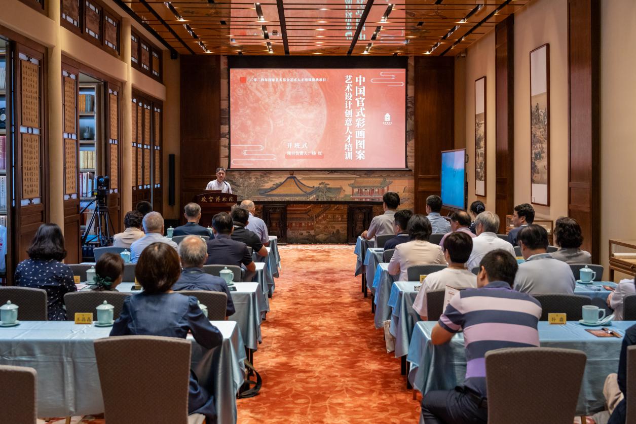 项目负责人杨红介绍本次培训项目内容与计划安排。首先向大家汇报了项目的价值、意义、特点等内容,尤其强调了本项目的目标是为培养满足艺术事业发展需要的创新型艺术人才作出贡献,积极尝试实现传统建筑彩画图案在新时代的创造性转化和创新性发展。其次主要介绍了项目的师资、学员情况及教学计划。本项目聘请业内38位顶级专家学者形成师资团队,从全国择优录取了30名具有建筑装饰及壁画设计,博物馆文创产品设计,服饰设计、展览、摄影、数字传媒等专业背景的中青年高层次设计人才。通过暑期七月、八月两个月的集中培训,让学员深入挖掘中国官式彩画图案中富含当代艺术价值的元素与文化基因,完成艺术作品设计。未来也将把其中的优秀成果努力转化为更为精彩的线上和线下产品,使中国官式建筑彩画艺术成为文化繁荣的重要力量,助推中华民族伟大复兴。让世界更多地了解“中国彩画”!