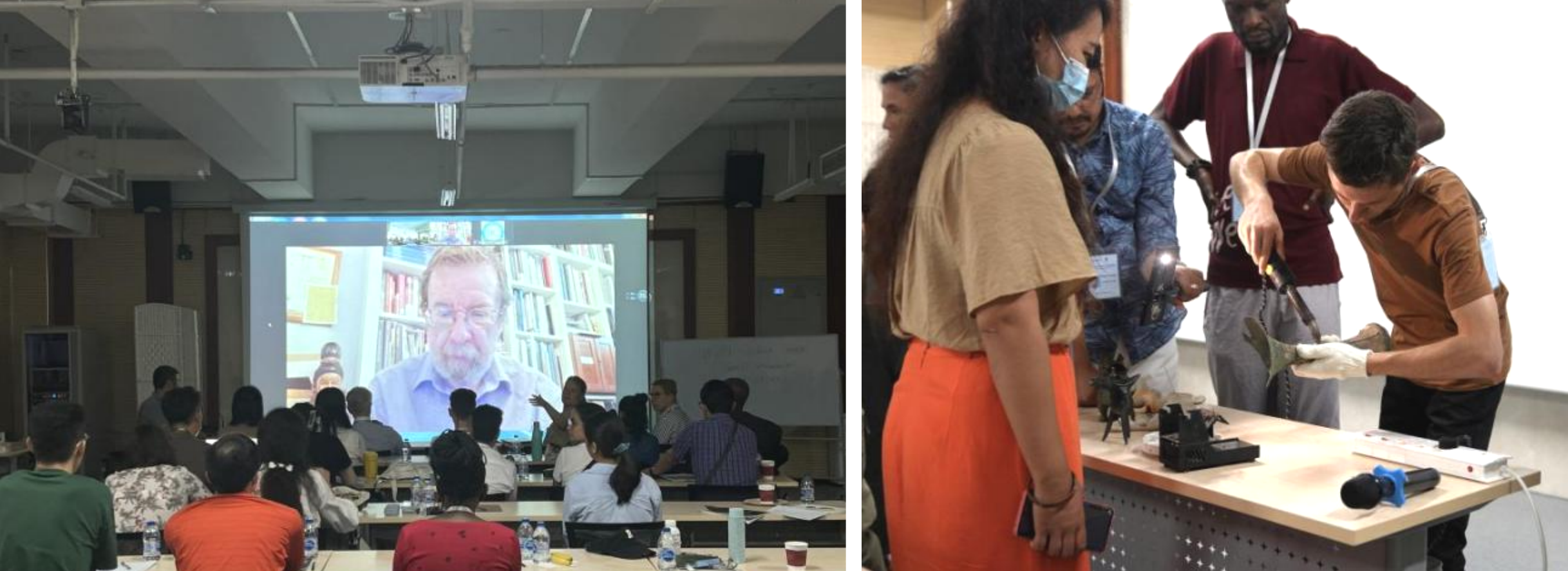 此次培训班邀请来自荷兰、美国、澳大利亚、英国、中国的12位专家进行授课。24位学员分别来自马来西亚、印度、菲律宾、尼日利亚、喀麦隆、津巴布韦、塞尔维亚、乌克兰、哥伦比亚、巴西、中国共12个国家。其中,中国学员分别来自中国国家博物馆、上海博物馆、南京博物院、香港特别行政区政府康乐及文化事务署、甘肃省博物馆、重庆市文物考古研究院、广东省文物考古研究院、扬州博物馆、散裂中子源科学中心、澳门文物保存修复学会、首都博物馆、故宫博物院等机构。在为期11天的时间里,授课专家带领学员开展了系统的金属文物保护修复方法、保护修复技术及检测分析方法的学习和实践。面对具有多种病害种类和复杂病害机理的各类金属文物,专家与学员就修复理念的发展变化、如何开展科学有效的病害防治、选择有效的保护修复方法和材料等问题进行了深入交流和热烈的讨论。不仅如此,大家还分享了大量的金属文物保护修复与研究的案例,并就青铜器、金银器、珐琅器等不同类型的金属文物的病害类型、制作工艺和艺术表现上的地区异同性进行了饶有兴致的交流,使得理论课程和具体实践紧密结合在一起,取得了很好的学习效果。