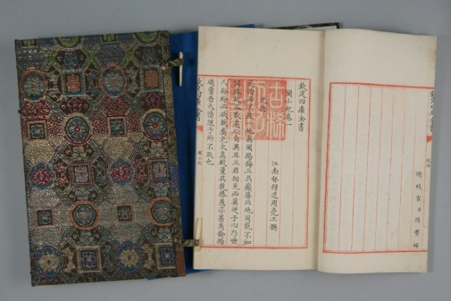 专藏,指专为《四库全书》等设置的藏书处。专藏之“鉴”,主要指对书籍内容进行政治性等多方面严格鉴选。官府组织相关机构和人员,按照一定标准对征集的图书进行全面审鉴和过滤,为此禁毁书籍数量达3千余种,销毁书板8万块以上。同时,乾隆帝命人从宁波天一阁藏书楼取经,修建了“北四阁”,又改建了“南三阁”,将《四库全书》陆续缮写七部,分置其中,“以彰稽古右文之盛”,表明自己重视文教,考察古事,以资借鉴,并惠及广大士人,带有宣示和推广意味。“七阁”之建,利用了各地优势,尤以文渊阁建筑和内外装修规格最高,包括书架配置等,集中了古代书籍保护的智慧和经验,具备隔火、防潮、防紫外线、防虫、防盗、防尘、防震、防剐蹭等多种功能。乾隆帝亲撰诗文,阐释阁名以水克火的理念,并以水喻文,阐发经、史、子、集四部学术源流与治学途径,分色装潢的多重含义等。各阁均配置《四库全书简明目录》和排架图,便于日常寻检核查。对于“七阁”的日常管理和“阁书”校阅抽换等,因地域不同而采取了灵活而又不失严格的管理方式。乾隆帝也不时下令协调解决管理中遇到的问题。