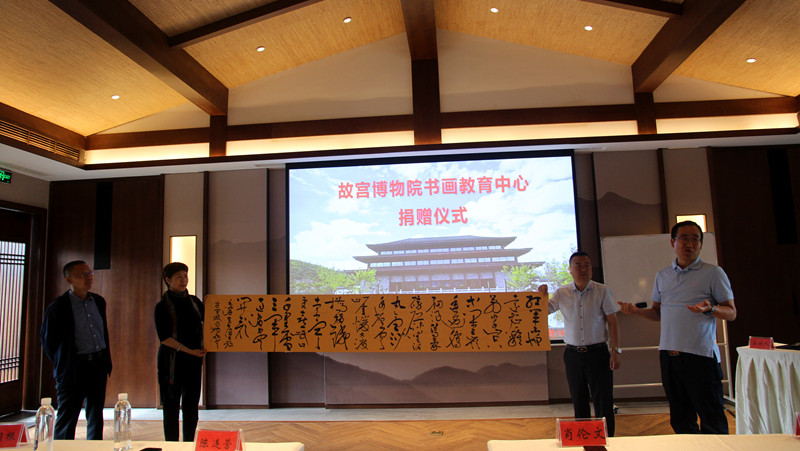 在讲座活动开始之前,进行了故宫博物院向修文县文旅局捐赠书法教材和书画作品的简短仪式。陈连营主任代表故宫博物院向修文县委常委、县委宣传部部长肖伦文转交了程同根校长书法作品36幅、书法教材300本,肖伦文代表修文县对故宫博物院的捐赠表示感谢,对参与公益讲座活动的故宫专家表示感谢,并表示希望借此机会,加强与故宫博物院的联系和开展更多的合作,也希望故宫博物院继续对修文的文教事业发展给予无私的支持。