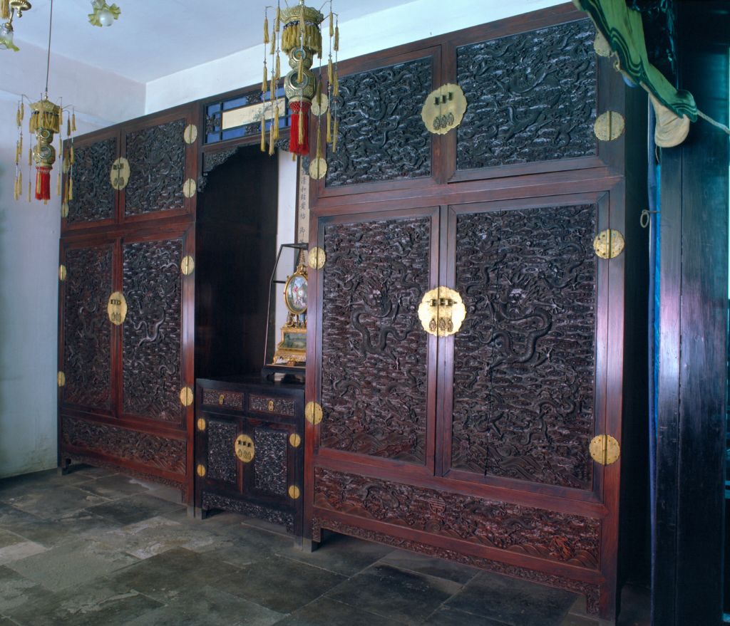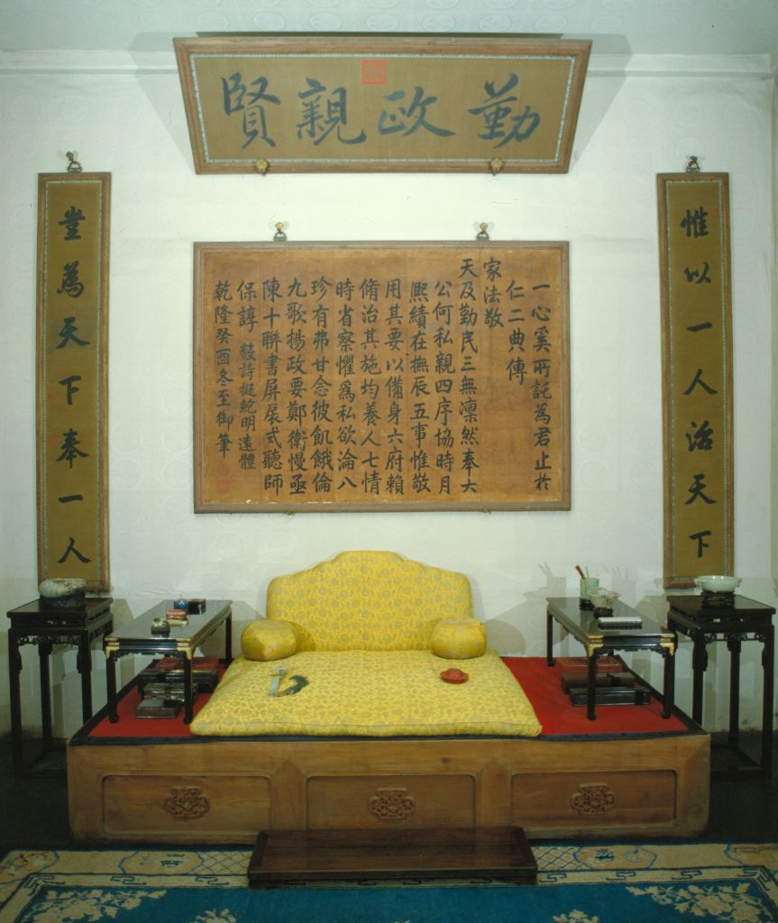 养心殿西暖阁前室,亦称“勤政亲贤”殿。北设宝座,南为窗,东有板墙开门,与养心殿明间相通,为皇帝召见大臣之所。窗外抱厦内围有木屏,与明间相隔,较为隐密。现为宫廷生活原状陈列。