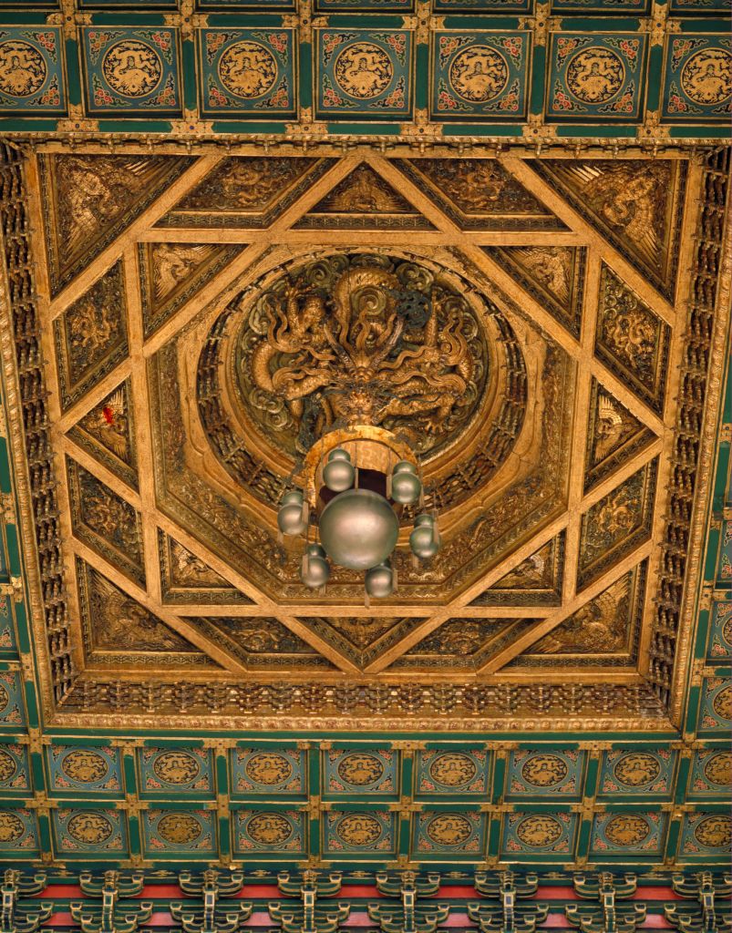 建筑物室内天花如穹隆状的装饰。由方井、八方井、园井层叠垒而成。正中多雕成蟠龙状,口衔宝珠。藻井一般用于较重要的殿宇。