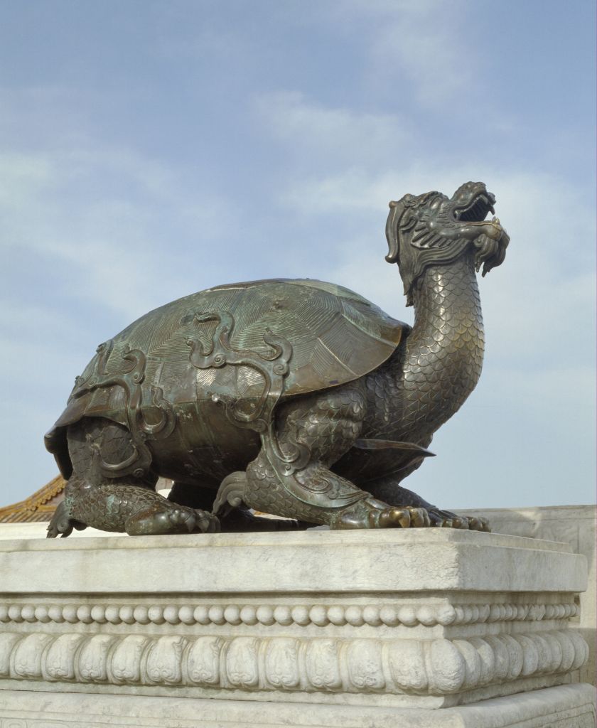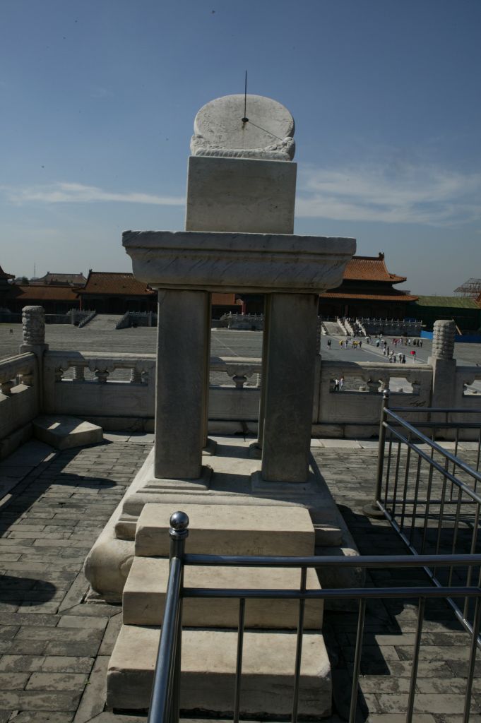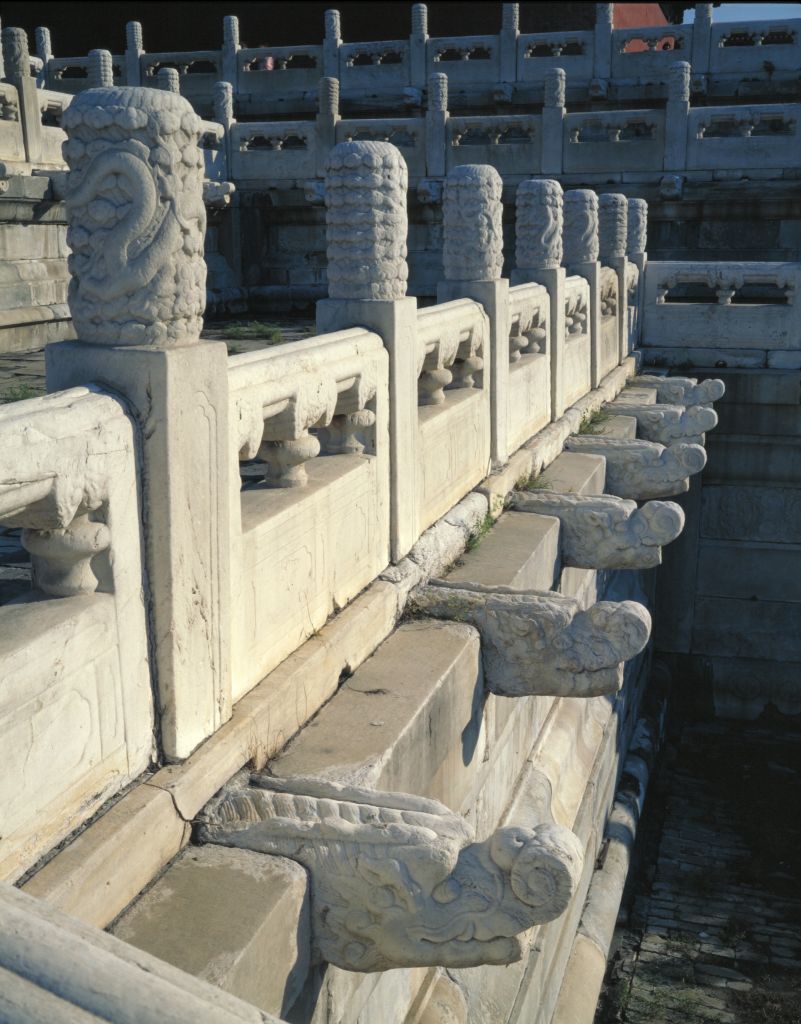 太和殿前有宽阔的平台,称为丹陛,俗称月台。月台上陈设日晷、嘉量各一,铜龟、铜鹤各一对,铜鼎18座。龟、鹤为长寿的象征。日晷是古代的计时器,嘉量是古代的标准量器,二者都是皇权的象征。殿下为高8.13m的三层汉白玉石雕基座,周围环以栏杆。栏杆下安有排水用的石雕龙头,每逢雨季,可呈现千龙吐水的奇观。