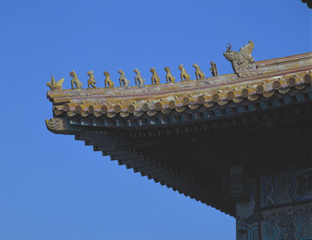 又称小兽,屋顶檐角所用装饰物。根据建筑物的体量大小定其使用数量,一般采用单数,太和殿用10个,属于特例。其排列顺序为龙、凤、狮子、天马、海马、狻猊、押鱼、獬豸、斗牛、行什,多为有象征意义的传说中的异兽。走兽所处的位置,在垂脊、戗脊的下端,正是几坡瓦陇上端的汇合点,为封护盖住交会线的连砖的上口,必须在连砖上覆盖脊瓦;因其斜下,若无措施不免有下滑之虞,故在交梁上需用多数铁钉加固,为掩饰铁钉的痕迹,于是在钉帽上加饰了一系列的小兽形象,起到美化建筑的作用。后来建筑技术不断发展,屋檐部位不需要加铁钉,而走兽的形象却保留下来,成为建筑等级的标志和建筑装饰构件。
