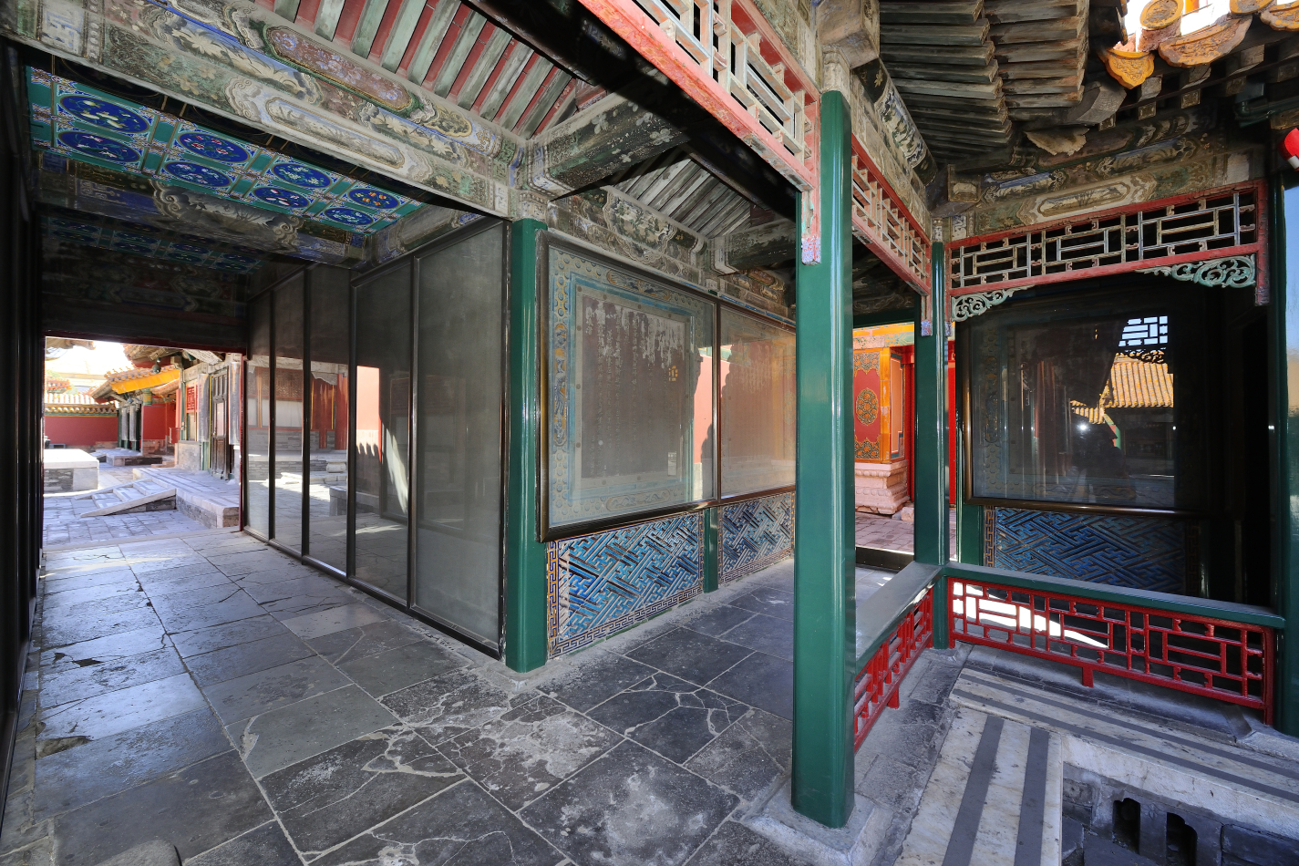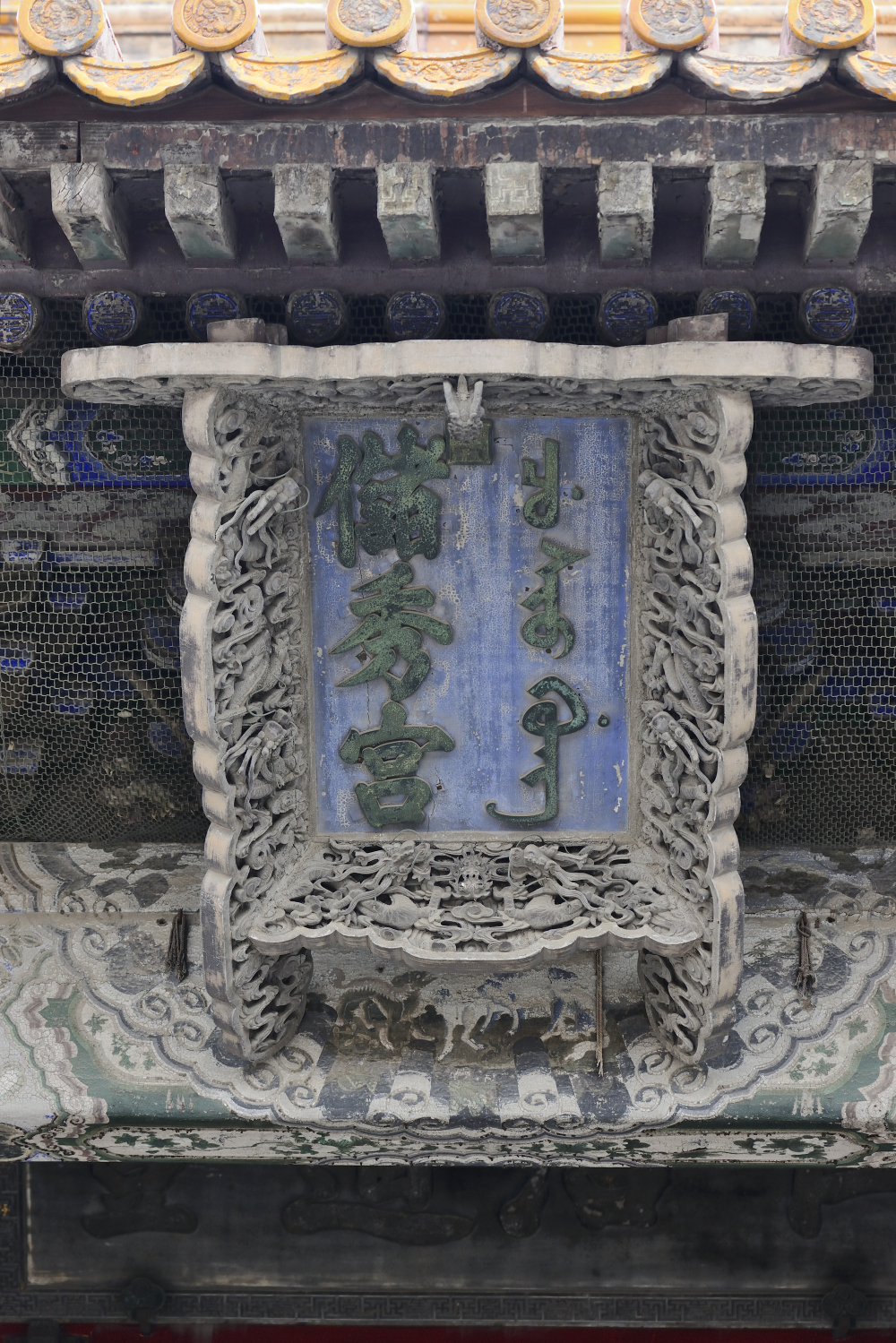 储秀宫的庭院宽敞幽静,两棵苍劲的古柏耸立其中,殿台基下东西两侧安置一对戏珠铜龙和一对铜梅花鹿,为光绪十年慈禧五十大寿时所铸。东西配殿为养和殿、绥福殿,均为面阔3间的硬山顶建筑。