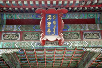 亭和抱厦顶均为绿琉璃瓦黄剪边,攒尖顶上安琉璃宝顶。一斗二升交蔴叶斗栱,檐枋下安华板,方柱。亭东西两侧为石雕栏板,同时也是桥的栏板,南北两面在石栏板中间设两步台阶为亭的出入口。方亭内天花正中有双龙戏珠八方藻井,周围为百花图案天花,檐下苏式彩画。抱厦三面开敞。
