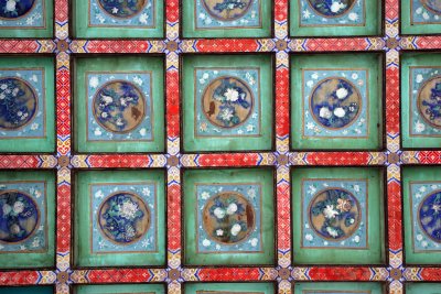 亦称顶棚。建筑物内用以遮蔽梁以上部分的构件,一般可分为硬天花、软天花。硬天花以木条纵横相交成若干格,也称为井口开花,每格上覆盖木板,称天花板,天花板圆光中心常绘龙、龙凤、吉祥花卉等图案。软天花又称海漫天花,以木格蓖为骨架,满糊麻布和纸,上绘彩画或用编织物,为等级较低的天花。