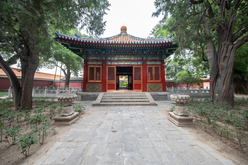 临溪亭位于花园中部偏南,建在矩形水池当中之单孔砖石券桥上,东西两面临水,南北出阶,与花园南入口、假山以及北部的咸若馆、慈荫楼同处于院落南北中轴线上。亭平面方形,面阔、进深各3间,四面均当中开门,斜方格槅扇门各4扇,两侧皆为斜方格槛窗,窗下槛墙贴饰精美的黄绿色琉璃花砖,临水两侧门前加设木护栏。亭之屋顶为四角攒尖式样,黄琉璃瓦绿剪边,檐下施斗栱。室内为花卉图案海墁天花,当心绘蟠龙藻井。