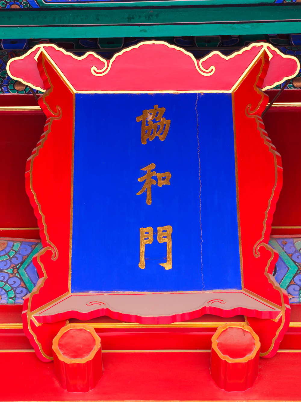 协和门为屋宇式大门,建筑面积约350m2。东向,面阔5间,进深2间,黄琉璃瓦单檐歇山顶,台明至正脊高11.43 m。七檩中柱式大木结构,彻上明造,檐下单昂三踩斗栱,龙锦枋心金线大点金旋子彩画。明间及左右次间各安朱红色宫门2扇,嵌鎏金铜钉。在清代仅作重新修缮,因此建筑基本保留明代构造,斗栱和彩画皆存明代特点。