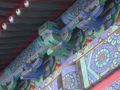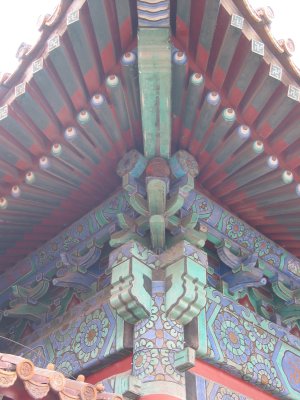承托建筑物檐宇部分的构件。主要由方形的斗和弓形的栱经多重交叉组合而成。每一组合称一攒。按安装部位分科,位于柱头上的称柱头科,位于屋角柱上的称角科,分布于柱间部位的称平身科。斗栱对屋檐有支撑和减震作用,也有较强的装饰性,因此,多用于较高等级建筑上。斗栱发展至清代,被作为建筑模数使用,一座建筑的所有尺度均以斗口为单位,长度同于最下坐斗的开口大小。