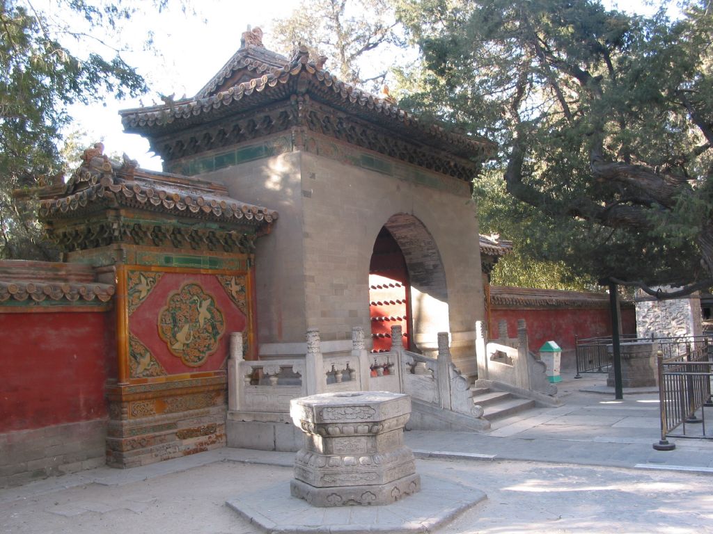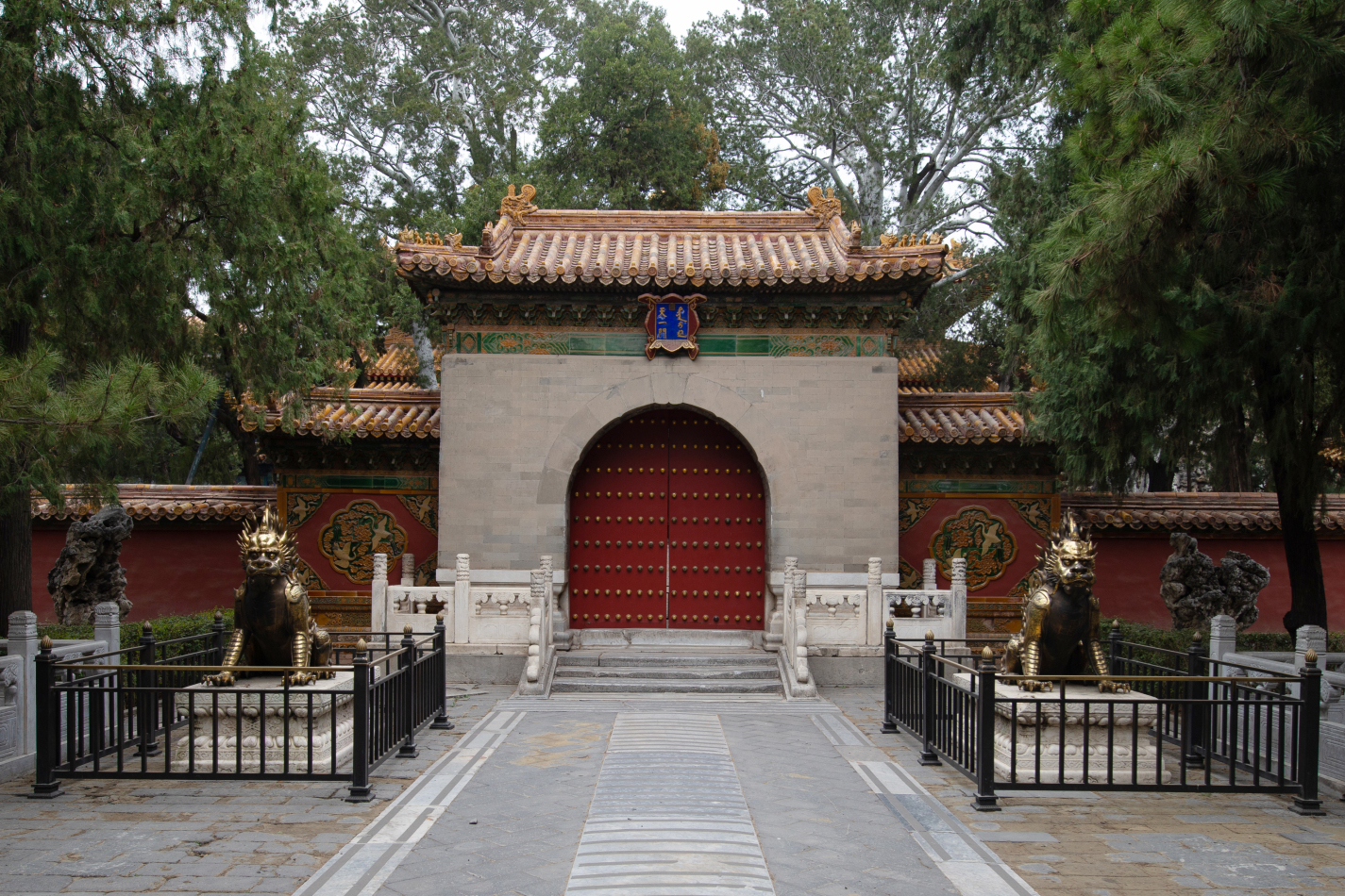 天一门两侧各出琉璃影壁与院墙相连,影壁的盒子与岔角部位饰琉璃仙鹤、云朵,做工精美。门前左右陈列铜镀金獬豸各1,御路正中设青铜香炉1座。门内正对连理柏1株,枝繁叶茂,苍劲古朴。