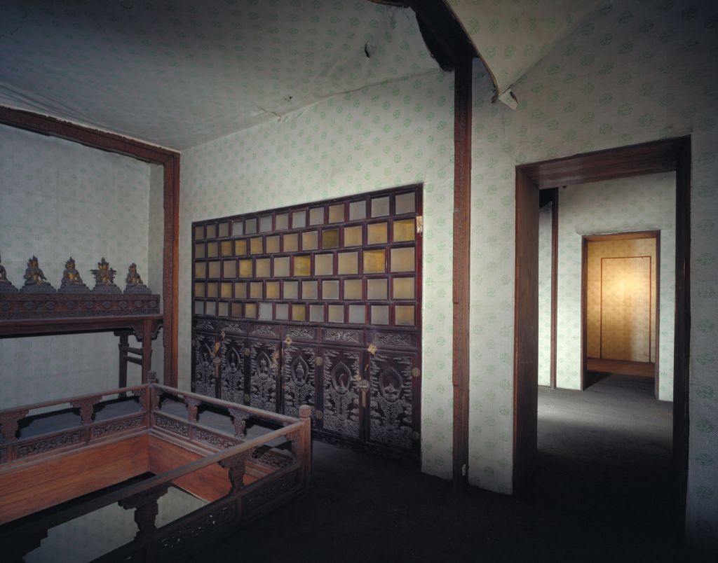 楼上明间原供木雕金漆宗喀巴像,三面墙壁挂释迦画传、宗喀巴画传唐卡。其余6间正面设供案,供显、密主尊像,每室9尊,共54尊,与楼下6室所供54尊护法神像相对应;两侧面设壁嵌式千佛龛,每间供小铜像122尊,6室共计732尊;千佛龛下为壁隔式紫檀木经柜,藏贮各种佛经。
