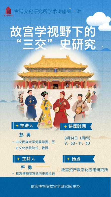 2025年8月14日下午,故宫博物院故宫学研究院主办、宫廷文化研究所与数字与信息部承办的“宫廷文化研究所系列学术讲座”第二讲,在故宫博物院数字化应用研究所报告厅举行。本次讲座特邀中央民族大学彭勇教授,以“故宫学视野下的“三交”史研究”为题作专题演讲。讲座由故宫博物院宫廷历史部主任、研究馆员严勇主持,来自故宫学研究院、宫廷历史部、图书馆等部门以及北京部分高校、研究院的师生现场聆听了讲座。