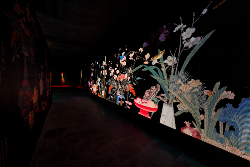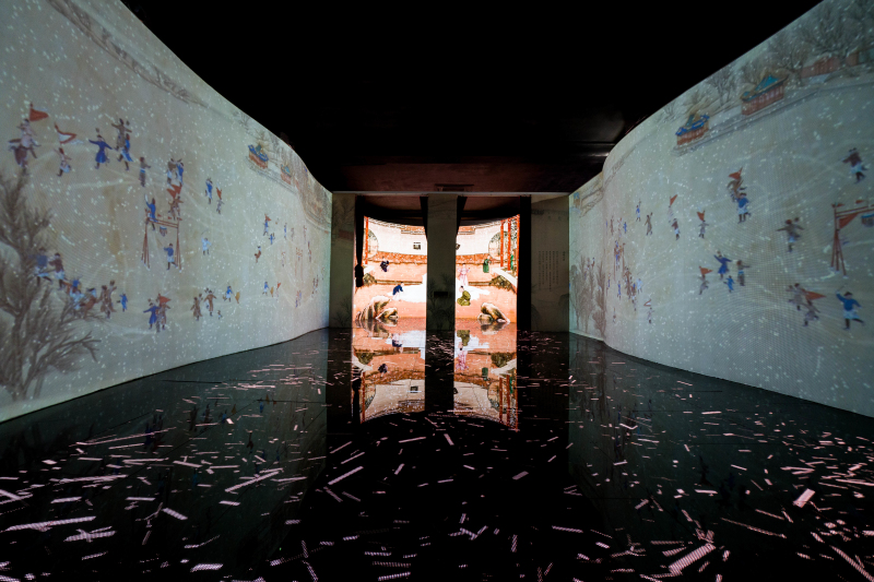 此部分源于故宫博物院藏画中描述的皇家点亮宫灯、观赏烟火等习俗。通过地屏及镜面投影装置,营造出一个沉浸式的新媒体空间。根据院藏《雍正十二月行乐图》,墙上的皇家园林与宫殿上悬挂的宫灯依次点亮,脚下与天际线上空,数字代码生成的璀璨烟花相映绽放,变换各式图案,在传统与当代中进行奇妙的穿越。