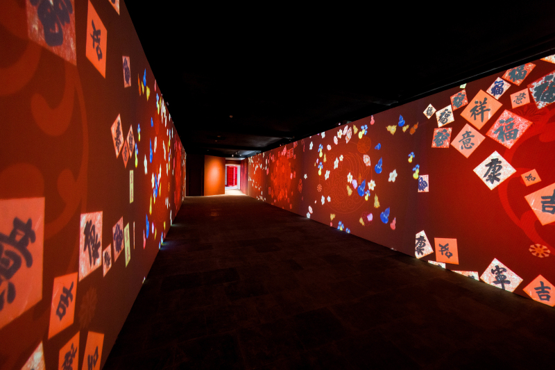 此部分源自皇家过年最重要的两件事:开笔书福、写吉语——帝王以福赐予天下苍生,祈求天下安康吉祥。这里同样是交互空间,墙面投影汇集了紫禁城帝王所写的各式“福”与吉语、带有“福”字的印章,以及各色吉果与花朵。观众张开手臂,可以收纳从天而降的吉庆百福,在纳福迎祥的欢乐氛围中,迎接新的一年。
