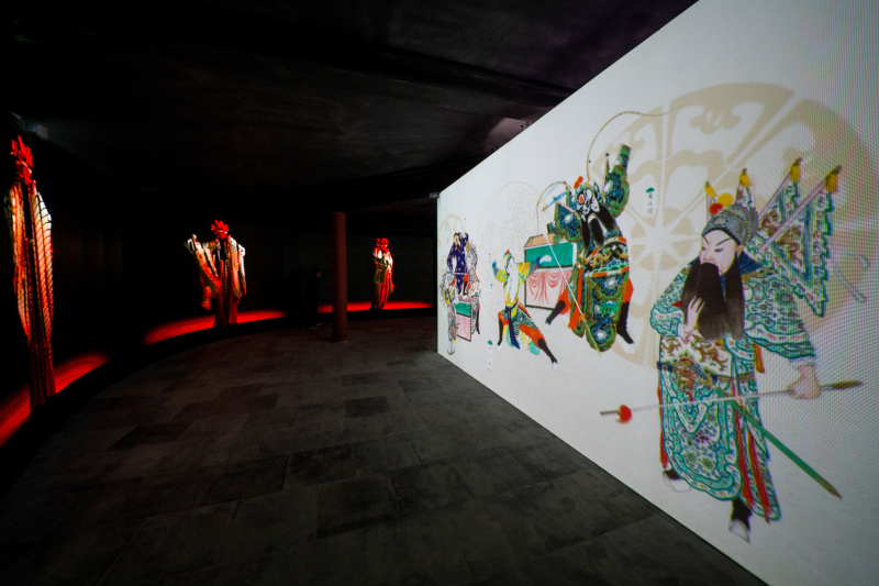 皇家的过年娱乐少不了观赏大戏,故宫博物院至今仍留存着各式戏画谱本。在“戏幕画阁”中,一面是故宫博物院典藏的戏谱画人物正顾盼生辉、矫健灵活,对面的弧形屏幕则是经过当代艺术抽象演绎的京剧人物,显得沉稳大气。传统与当代搭配呼应,同一段戏曲,不同的表现形式,娓娓道来、感受独特。