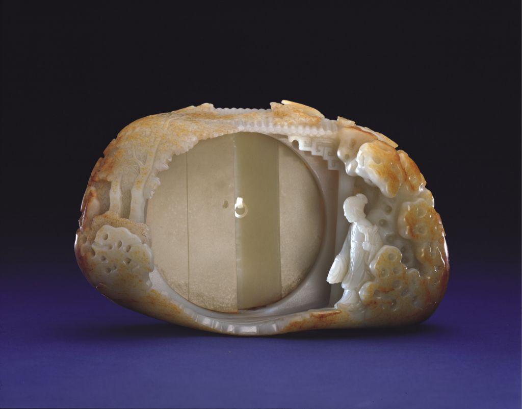 皇极殿西庑北展厅面积约340平方米,主题为玉及彩石类文物。中国传统玉文化源远流长,清代是中国古代玉石工艺发展的高峰,当时非常重视对原材料的选择,新疆和田玉依然占据着产品的主流,翡翠则在清代中晚期成为皇室新宠,地位不断提高。此外,还有为数可观的玛瑙、水晶、青金石、绿松石、孔雀石、芙蓉石、寿山石等材质的器物传世,其丰富多彩的面貌与新意迭出的意匠令人赞叹,其精雕细琢的工艺代表了清代玉石雕刻的水平。白玉雕桐荫仕女图山子与田黄三连印可以作为展品中的代表。白玉雕桐荫仕女图山子巧妙利用了制作玉碗后剩余的材料,将玉材中心留下的圆形空洞设计为月亮门,体现了玉雕工匠的卓越创造力。田黄三连印由一整块石料雕刻而成,三方印章通过环环相扣的石链结为一体,巧夺天工。田黄三连印身世离奇,本是乾隆帝做太上皇时所镌,清末溥仪离宫时将其携出,1950年才上交国家,并重新回到紫禁城中。