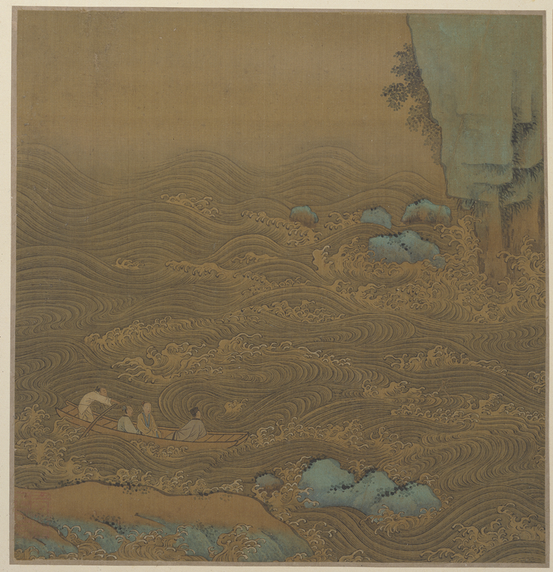 此图取南宋时期流行的“一角半边”式构图,以类似特写镜头的方式描绘了苏轼与友人泛舟于赤壁之下的情景,并着力表现了水纹,显示出这一时期赤壁题材绘画与“水图”相结合的特点。存世另有两件同题作品与此出于一稿,仅在细节描绘上略有区别,现分别收藏于美国堪萨斯纳尔逊-阿特金斯博物馆和台北故宫博物院。