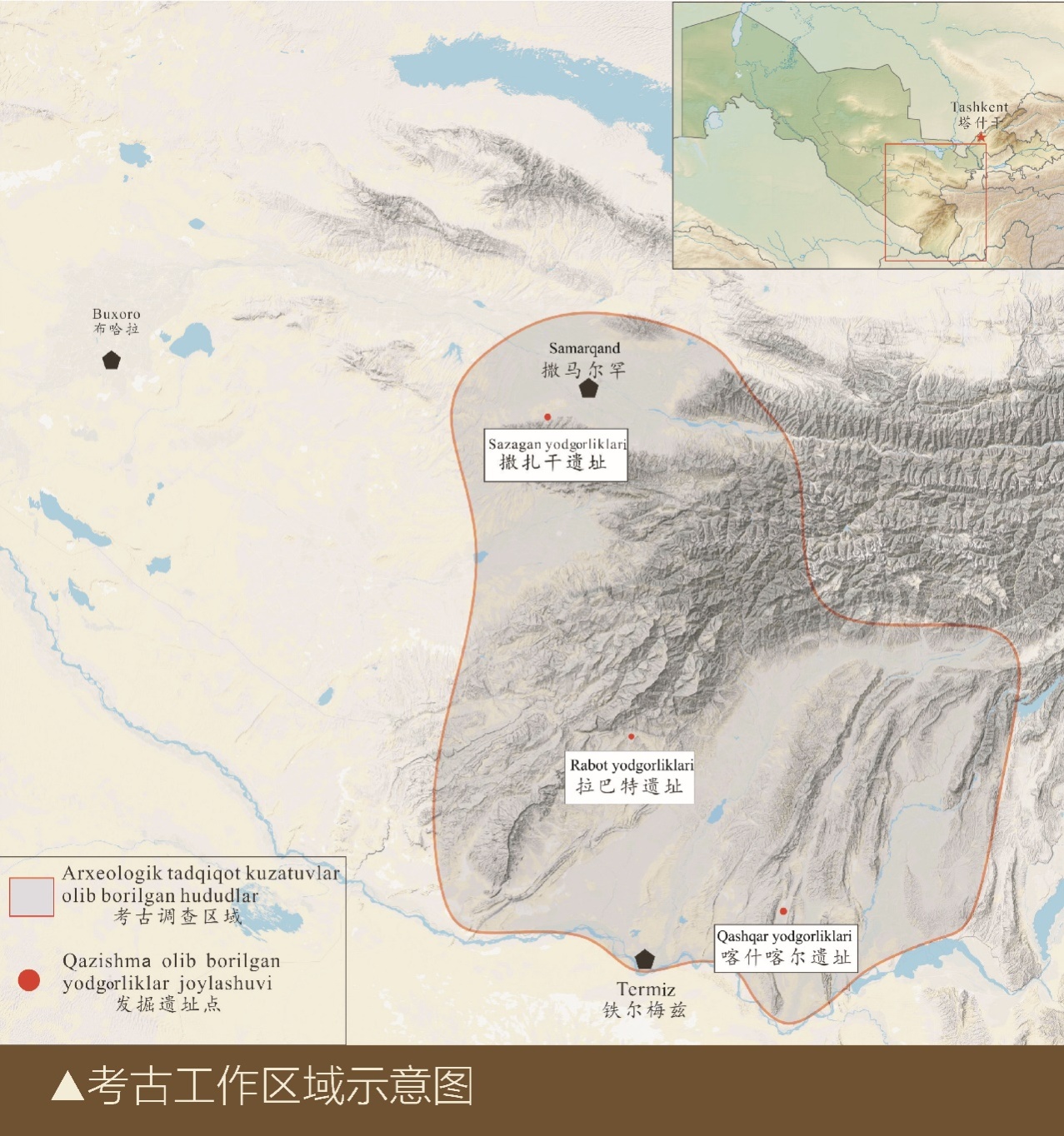 中亚地区自古以来是丝绸之路上往来商旅必经之地,也是东西方文明交汇的中心,在丝绸之路研究中一直是关注的焦点。乌兹别克斯坦历史悠久、文化灿烂,更与中国有着悠久的联系。两千多年前,汉代张骞为了寻找大月氏,“凿空西域”到达今乌兹别克斯坦境内,成就了探寻中亚地理和政治边缘、开启贯通中西“丝绸之路”的壮举。时至今日,国家“一带一路”倡议的实施,为中乌两国在新时期的文明交流互鉴带来大好契机。自2009年起,西北大学与乌兹别克斯坦科学院考古研究所等机构组建中乌联合考古队,追寻古代月氏人的踪迹。2017年开始,故宫博物院加入中乌联合考古队。通过考古调查和发掘,发现了大量不同时期和类型的文物遗迹和遗物,为我们进一步理解古代丝绸之路的繁荣兴盛、在全球视野下深入研究中国历史及中国与中亚地区的文化交往史提供了更加丰富的实物佐证。